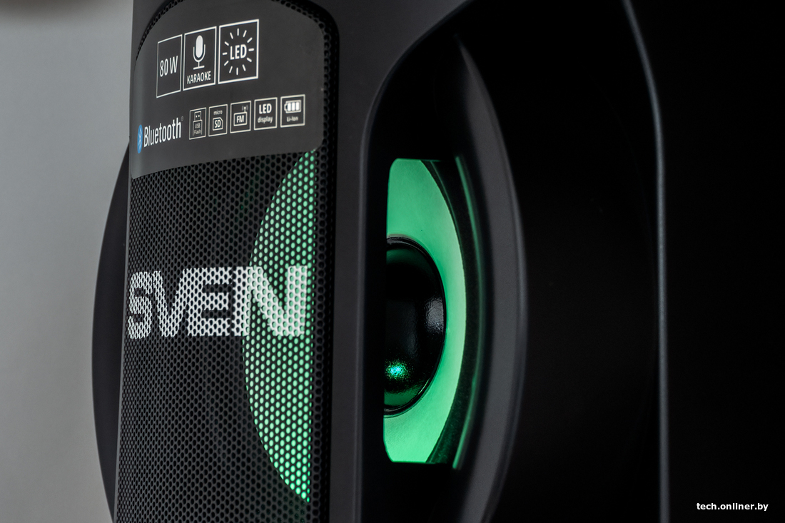 Как и в случае Sven PS-680, на панели управления этого патибокса расположилась бортовая панель небольшого самолета. TF и USB-карту, AUX и аж два микрофона вы сюда точно подключите. Можно регулировать эхо, высокие и низкие частоты, прыгать по радиочастотам и следить за этим через небольшой экранчик. То есть все звучит хорошо, пока дело не доходит до звука.