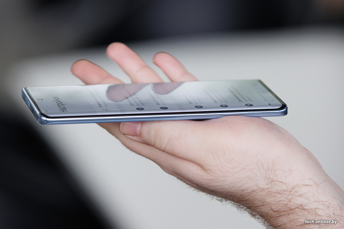 Дисплей смартфона (6,78 дюйма) — крутой, если не обращать внимания на недостаток в виде инвертирующихся цветов в местах скругления (слева и справа). OLED-матрица — яркая, с включенной автояркостью светится до тысячи с небольшим нит, если на нее падают прямые лучи. Отличный результат, на уровне упомянутого A54 от Samsung — в солнечную погоду вполне хватает.