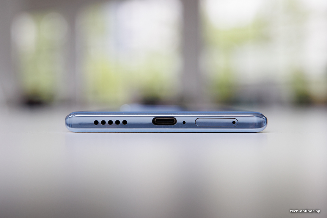 Тактильно «спинка» напоминает пластик, но в сети уверяют: на самом деле она стеклянная. Хорошо, что матовая, глянцевые панели сегодня не в особенной чести. На боковой грани: клавиша питания и совмещенная качелька регулировки громкости, снизу — USB-C и решетка динамика. В общем, все стандартно.