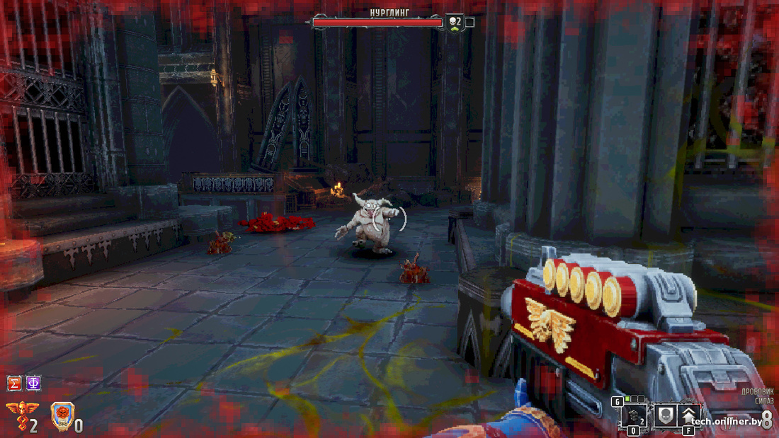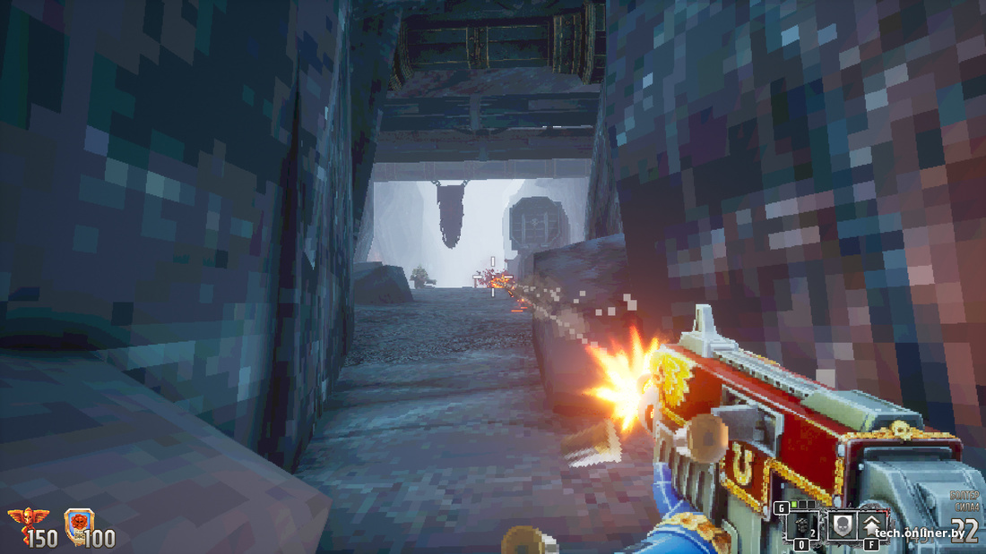 Поклонники Warhammer 40K и так разберутся, что к чему, а остальным по большому счету все равно, с чего началось. Boltgun встречает геймера характерной графикой: много пикселей и странная цветовая гамма — иногда напоминает «плохой» HDR. Имитация «древней» картинки является одной из фишек, однако в настройках игры есть раздел «Ретро», где все эти красоты — пиксели — можно убрать (или, напротив, усилить до уровня «у вас разрешение 640×480»). По умолчанию установлена серединка, и она самая интересная: флер старости присутствует, но не режет глаз. Полное же «сглаживание» лишает Boltgun ее важного компонента.
