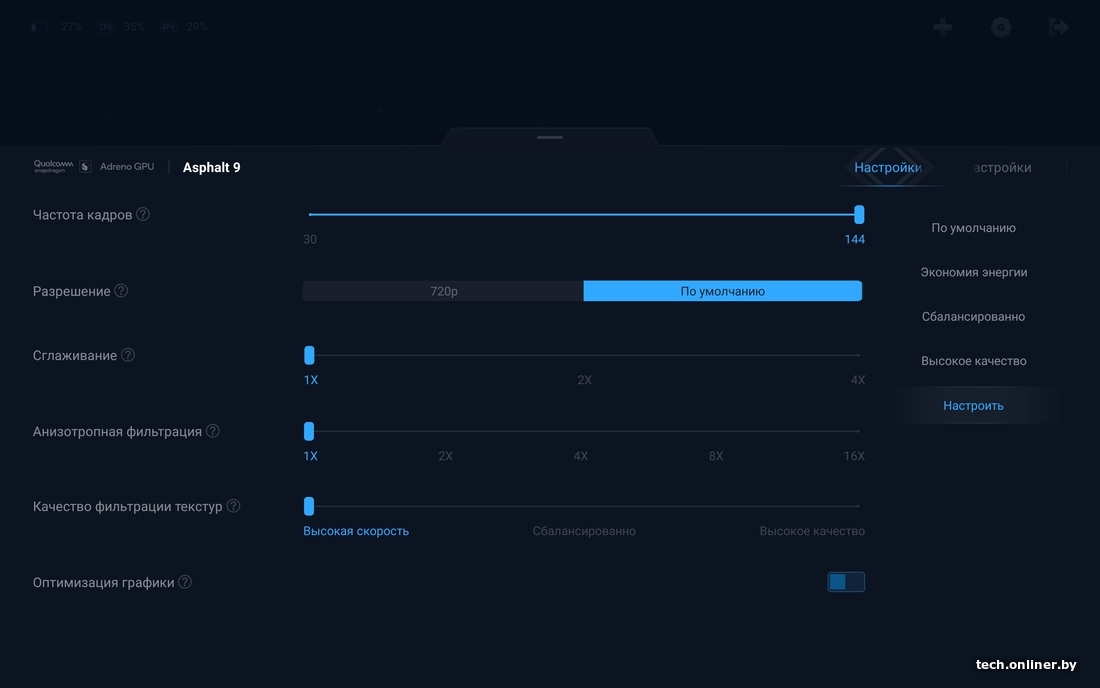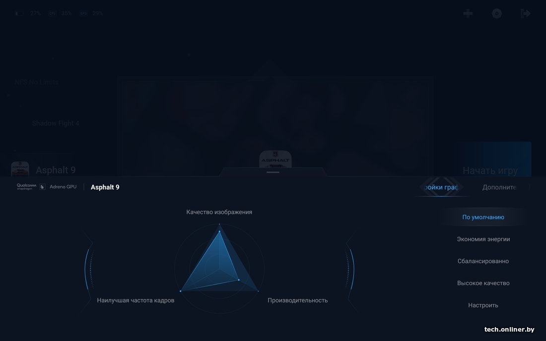 В играх планшет показал себя вполне «геймерским»: производительности чипа достаточно для графики в высоком разрешении в той же Call of Duty: Mobile, картинка во всех играх плавная, fps обычно на комфортном уровне. Небольшая просадка производительности была заметна в Need for Speed: No Limits — недоставало fps, что ощущалось после других, не менее красивых и требовательных игр, но «летающих» без намеков на лаги. Второй момент связан с воспроизведением звука, о чем говорилось выше. Вероятно, отчасти исправить ситуацию помогло бы встроенное геймерское ПО для тонкой настройки, однако мобильное устройство выбирает оптимальные параметры, а терять время, если вы не киберспортсмен, желания нет.