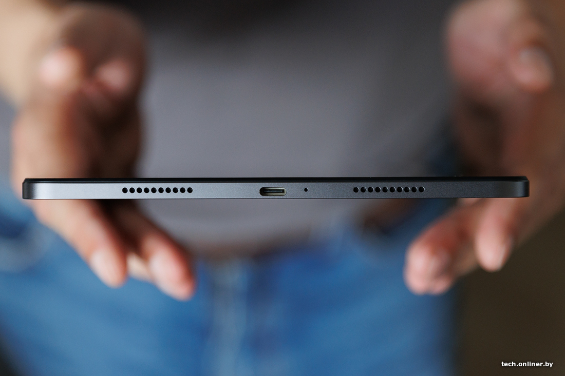 На левом и правом торцах размещены по два динамика, на правом между ними — разъем Type-C и один из микрофонов. Не верхнем торце, помимо кнопки громкости, пара микрофонов и слот для SIM-карт (без поддержки карт памяти). Внизу нет ничего, даже 3,5-мм разъема.
