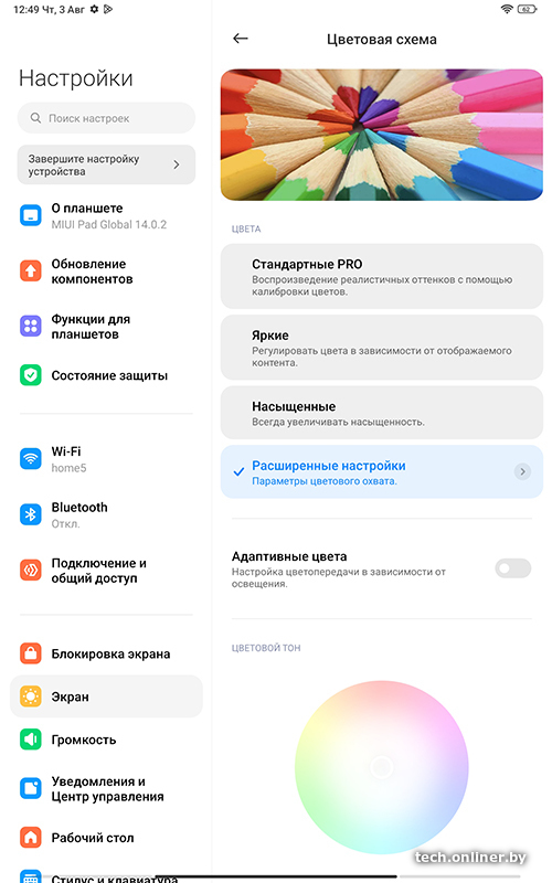 Экран имеет тонкие настройки цветности и температуры с готовыми пресетами, внешний сенсор позволяет менять гамму в зависимости от окружения, хотя обычно достаточно одного «статичного» режима, к которому со временем просто привыкаешь. В описании на сайте производителя указано, что экран поддерживает DCI-P3 и эмуляцию sRGB, дополняя словами «сверхточная передача цветов». В лаборатории мы не замеряли — поверим.