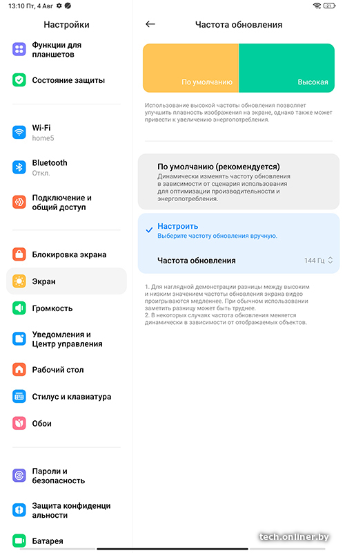 Xiaomi Pad 6 получил IPS-матрицу с диагональю 11 дюймов и разрешением 1800×2880 точек с соотношением сторон 16:10, а также поддержкой частоты обновления до 144 Гц. По умолчанию включены автоматический или адаптивный выбор, можно поменять в настройках на 60, 90 или 144 Гц. Важно: высокая частота работает, если конкретное приложение поддерживает ее.