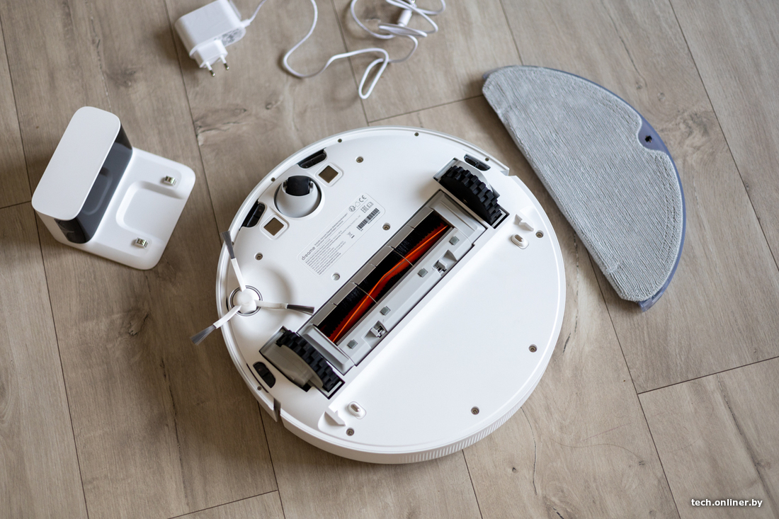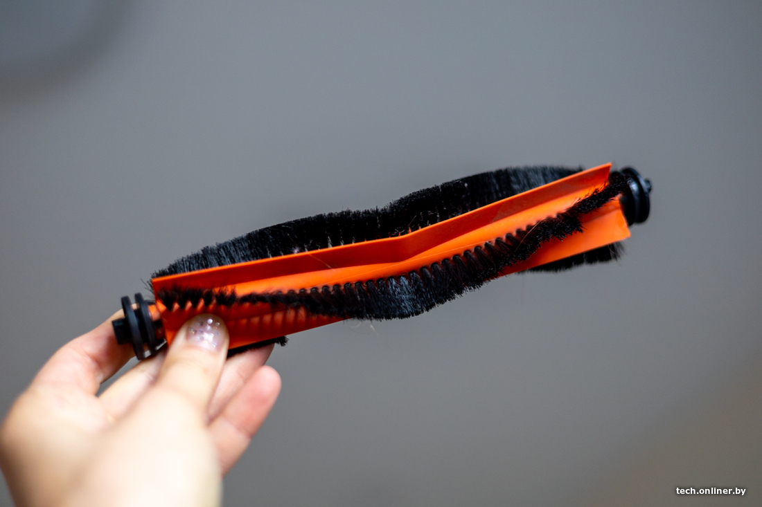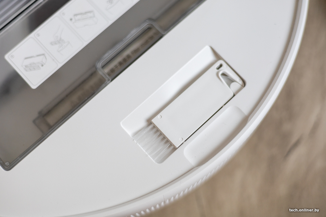 Тут все стандартно и без излишеств: сам робот, зарядная станция, кабель питания, боковая щетка (одна штука, без запасных), контейнер для влажной уборки, насадка-микрофибра, инструмент для очистки щетки и документация. Основная щетка разборная. Это существенный плюс, так как очищать от длинных волос или шерсти щетку гораздо удобнее, если она разбирается. На очистку тратится гораздо меньше времени, и можно не использовать ножницы, чтобы срезать намотавшийся мусор.