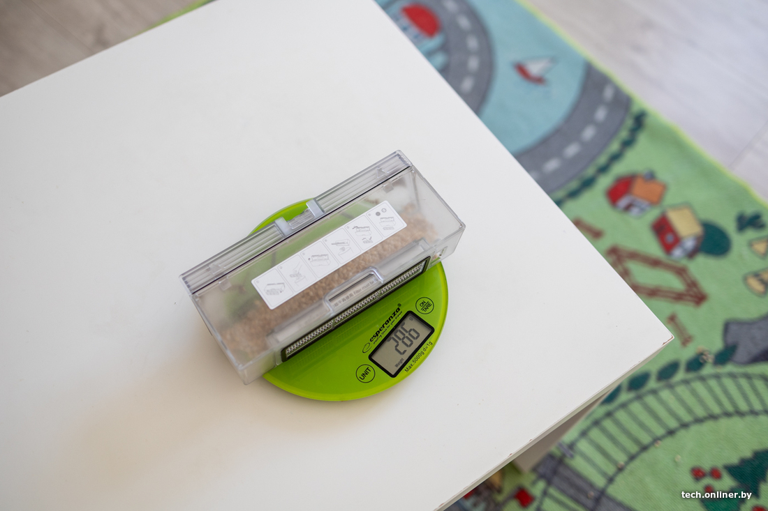 Теперь тест на качество сухой уборки. Рассыпаем 100 грамм перловой крупы на участке с ковром и ламинатом и проверяем, сколько робот из них соберет. Разница между пустым и полным контейнером — 97 грамм. Очень недурно!