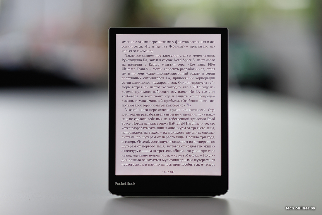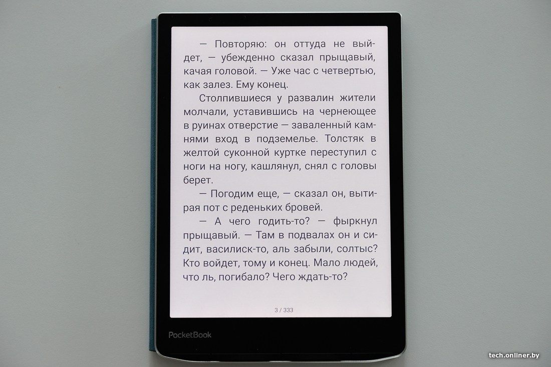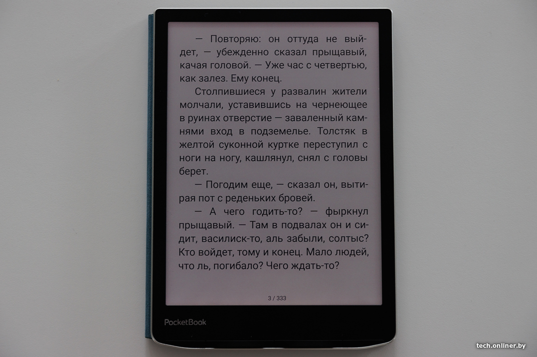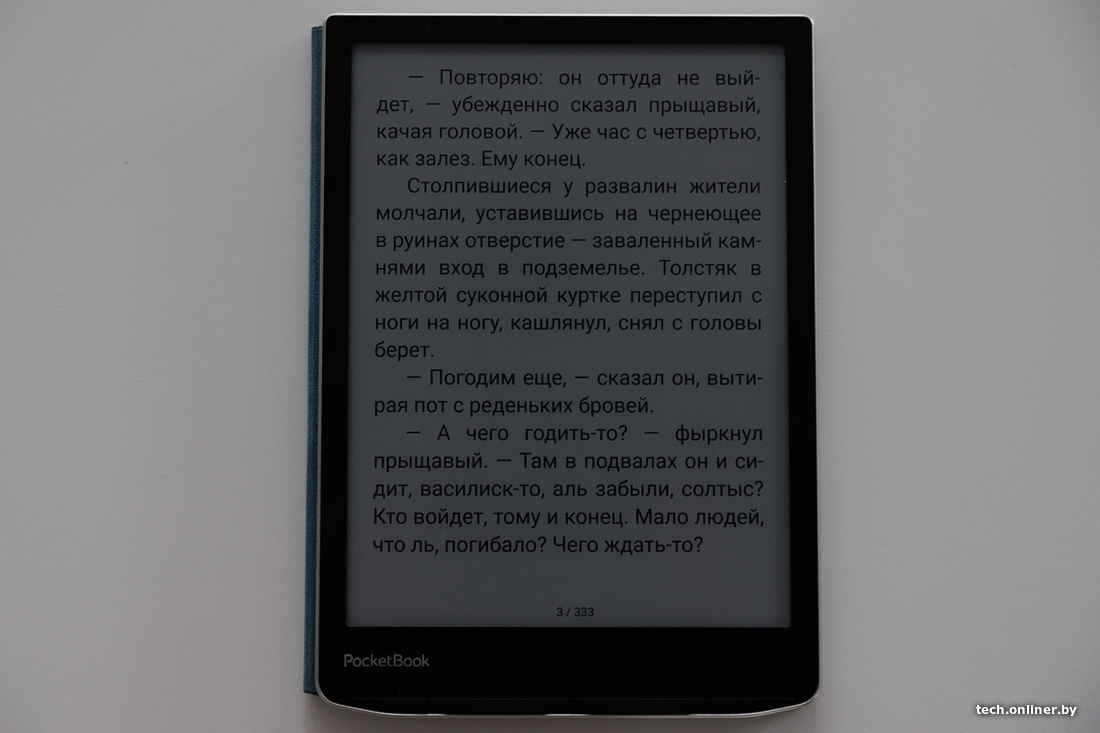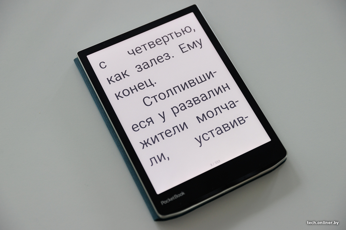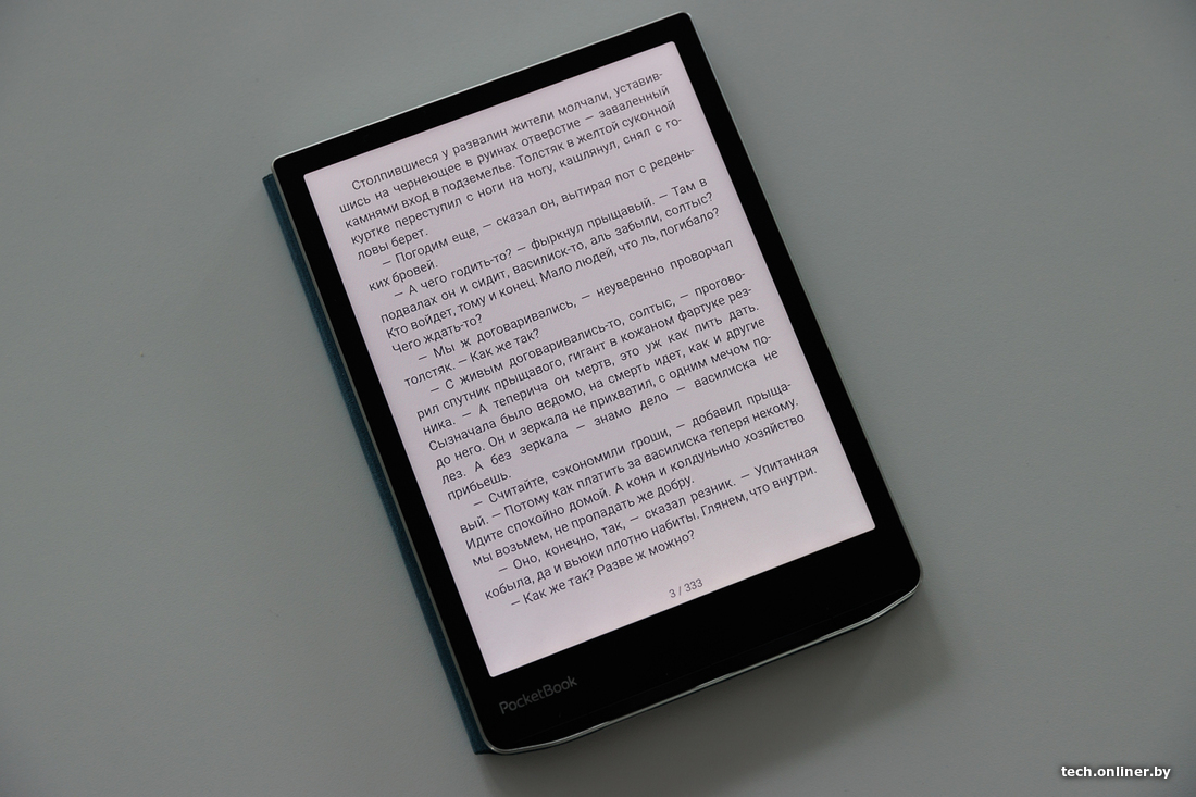 Как заметно на фото, цвет подложки не белый, а серый, немного напоминающий текстуру холста. Из-за этой серости контрастность текста у цветной читалки Pocketbook ниже, чем, например, у монохромной Kindle Paperwhite. При ярком освещении все считывается хорошо, но при плохом вынуждает включать подсветку раньше, чем на Kindle. Возможно, это отразится на времени работы, но за две недели тестов Pocketbook не заряжался ни разу. Так что в недостатки подложку заносить пока не будем, а скорее в особенности, к которым надо быть готовым заранее.
