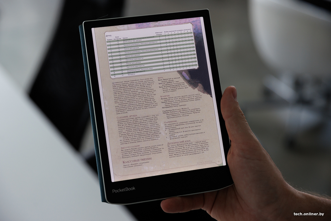 Тем не менее по меркам читалок разрешение у InkPad Color 2 высокое — 1404×1872. Поэтому проблем со считыванием текста любого размера не было, шрифты ровные и четкие, а экран с диагональю 7,8 дюйма вмещает больше информации, чем популярные 6-дюймовые читалки. Особенно на нем удобно читать контейнеры вроде PDF, где нельзя без искажений масштабировать текст, иллюстрации и таблицы со схемами.