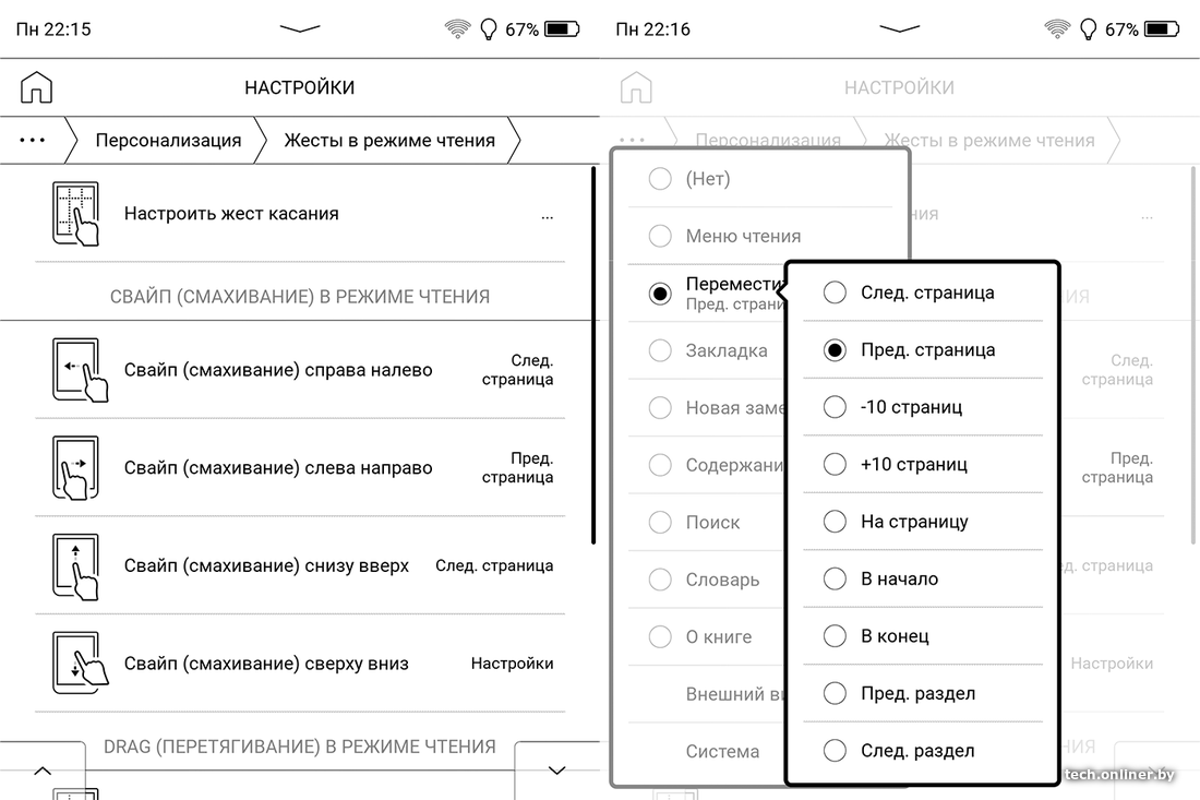 Подсветка, как и во всех ридерах, очень полезная функция. В Pocketbook ее регулировка по умолчанию настроена медленным свайпом по правой стороне. А цветовая температура — по левой стороне. Запас обеих регулировок большой, поэтому можно подстроить читалку под условия освещения и собственный комфорт.
