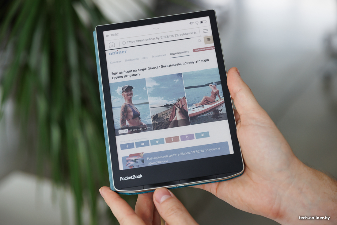 Было опасение, что при таких размерах ею неудобно будет пользоваться, но нет: легкая, комфортно лежит в одной руке, а для перелистывания есть физические кнопки (в дополнение к сенсорному экрану).