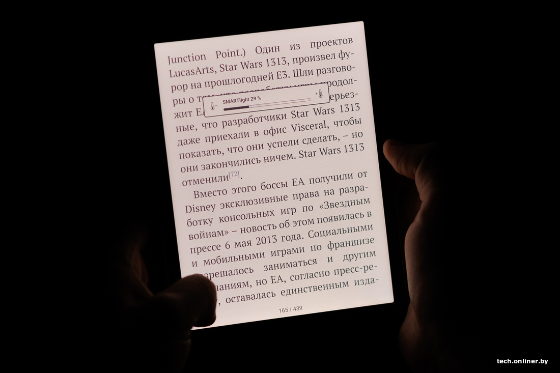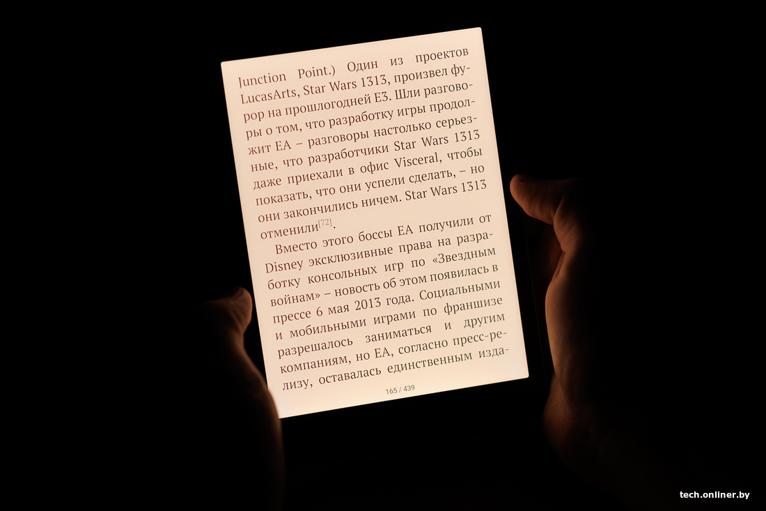 В темноте подсветка, конечно, выручает. Читать приятно, на глаза сильно не давит. Очень помогает регулировка цветовой температуры.