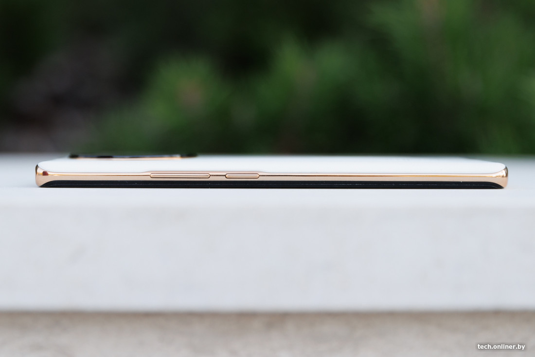На экстерьер смартфона в компании явно делали ставку: общий дизайн создавался при участии Маттео Менотто. Дизайнера, ранее работавшего с домом Gucci. Фронтальная сторона 11 Pro занята экраном с заметно скругленными гранями слева и справа, с тыльной стороны — панель, прикрытая экокожей, а также круглая «шайба» основной камеры.