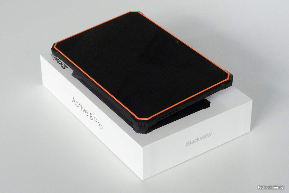 Начнем с того, что Blackview Active 8 Pro весит чуть менее килограмма — 976 граммов. То, что это много, стало понятно после случайного падения планшета на палец ноги. Габариты — 256,3 × 165,8 × 16,8 миллиметра.