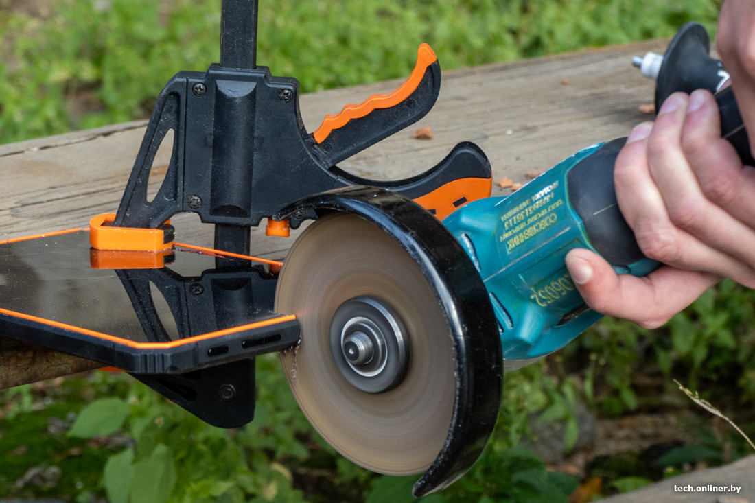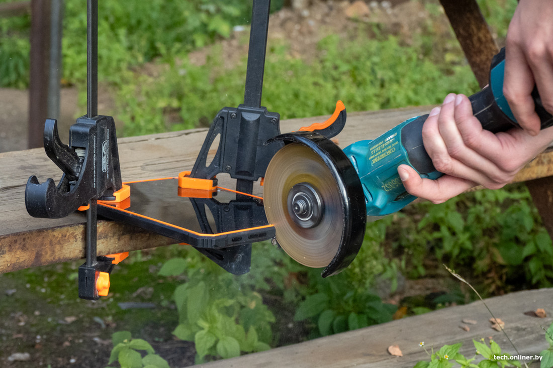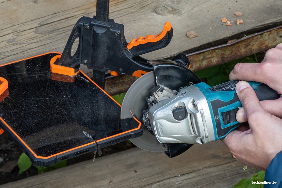 Раз все работает, берем в руки болгарку. Не обращайте внимания, как ее держит журналист — он вообще ее первый раз в жизни видит. Пилим планшет, принимая во внимание тот факт, что где-то по пути следования может оказаться аккумулятор. А его поведение при такой внешней агрессии непредсказуемо.