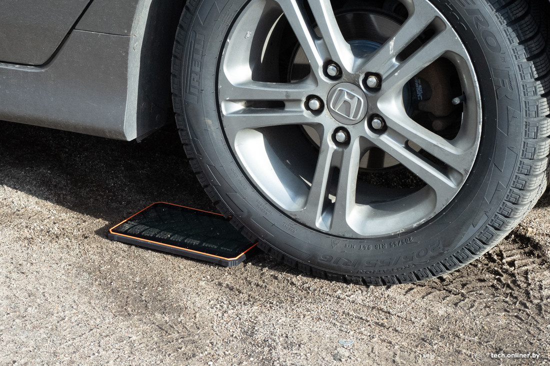 Поэтому первое испытание — щадящее (как нам казалось). Blackview Active 8 Pro отправили под колесо автомобиля. Предполагалось, что площадь соприкосновения будет большой, вес распределится, плотный песок станет подушкой, и никто не пострадает.