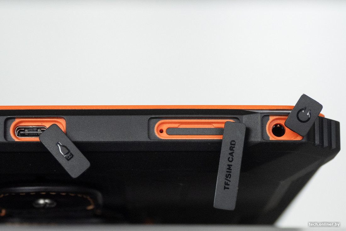 На верхнем торце лишь один из микрофонов, на правом — 3,5-миллиметровый разъем для наушников, слот для двух SIM-карт / карты памяти и порт USB-C для зарядки. Все они закрыты резиновыми заглушками на «поводке». На новом устройстве вынимать их непросто, так как сидят элементы очень плотно. Здесь же отверстия, за которыми скрыт динамик. На нижнем торце ничего нет.