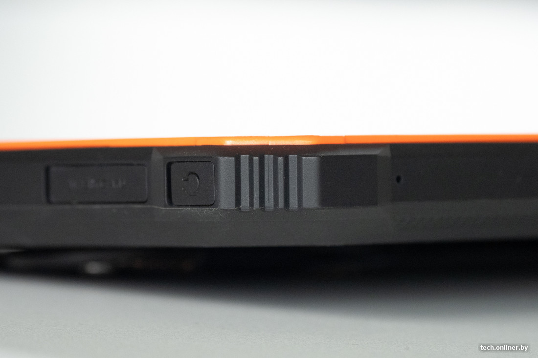 Если удерживать планшет в панорамном режиме, кнопки включения и громкости размещаются на левом торце вверху. Это три пластиковых элемента, не прикрытых, к нашему удивлению, резиновой мембраной. Удивительно, так как именно через цели в таких кнопках влага и песок способны проникнуть внутрь. Не исключено, что мембрана находится глубже, а кнопки установлены поверх нее.