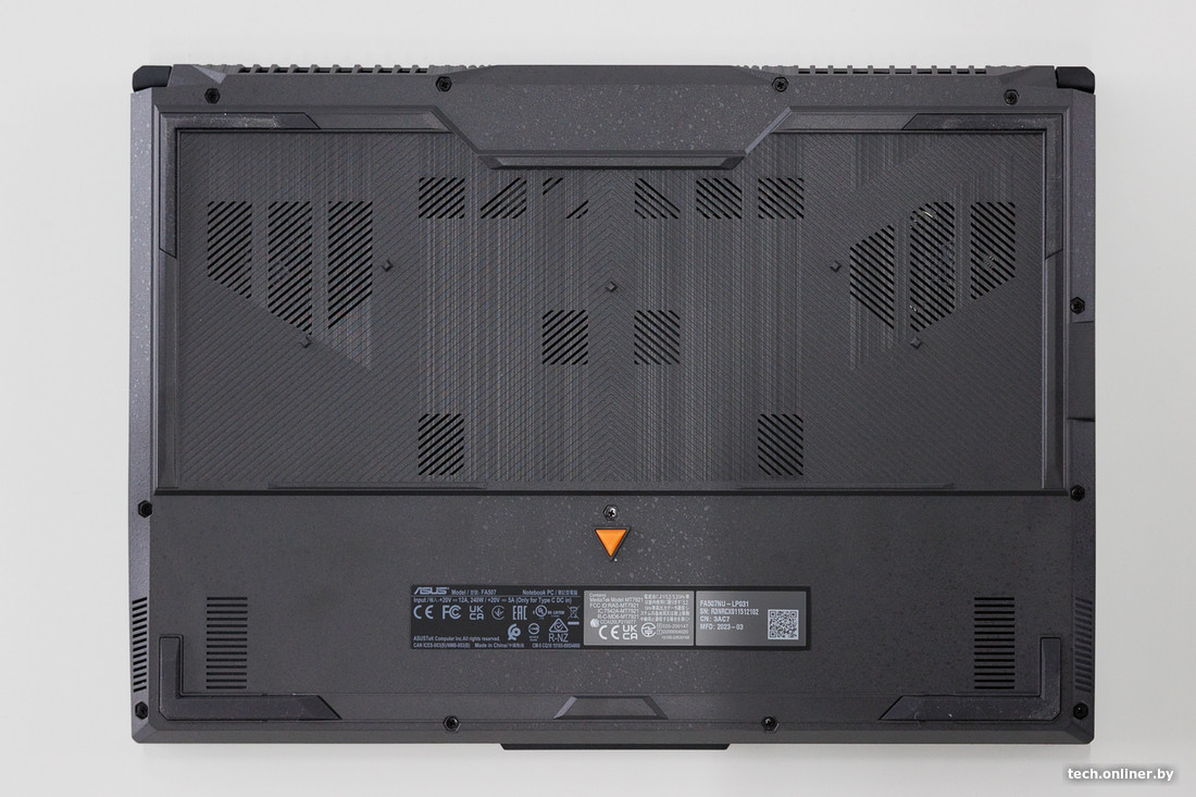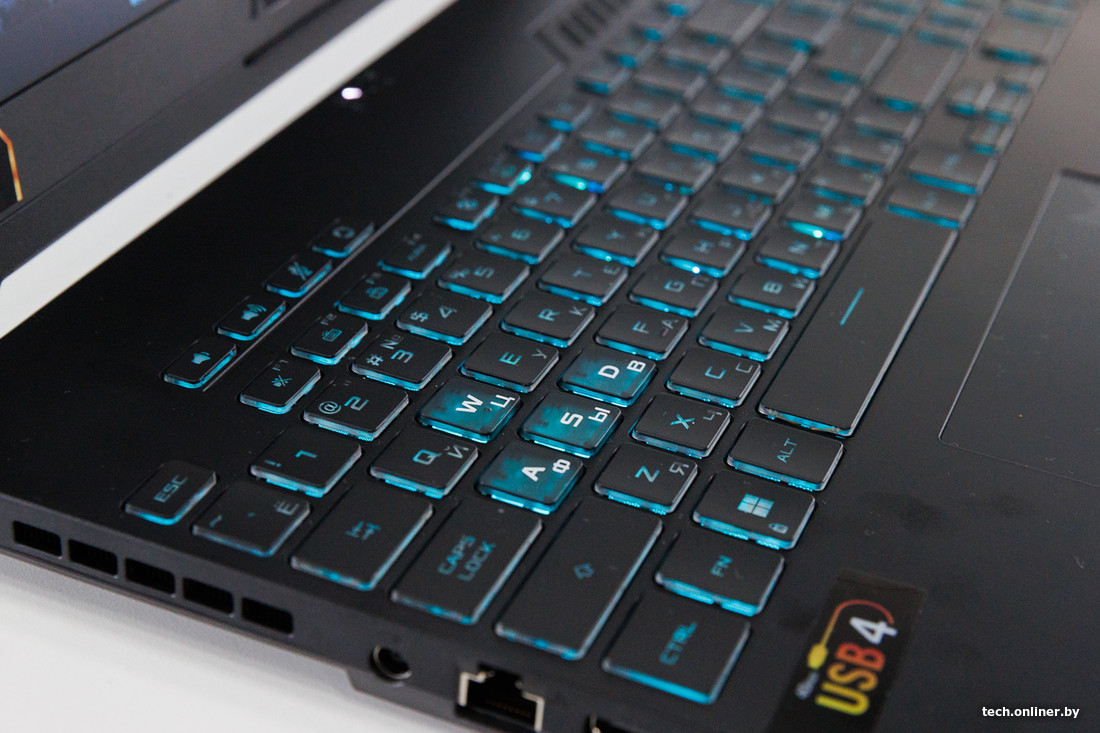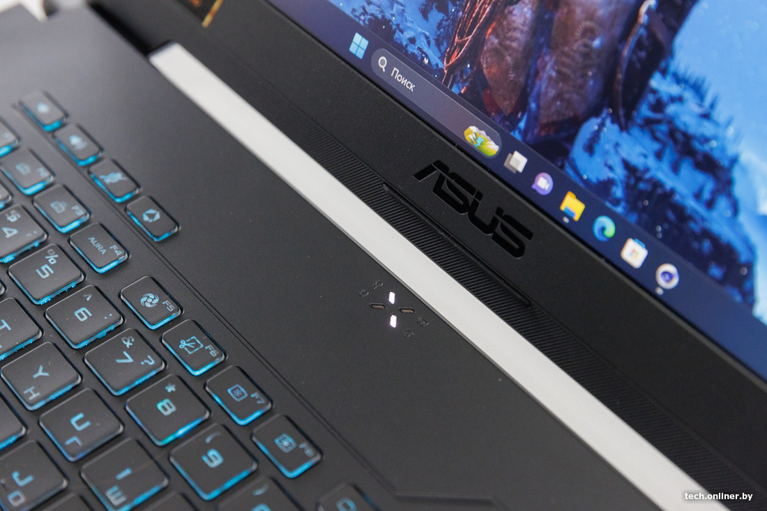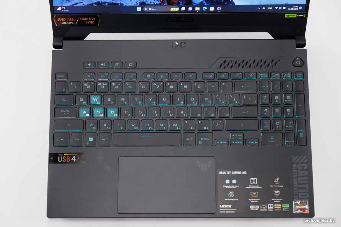 ASUS TUF Gaming выделяется наиболее «игровым» дизайном. Официально его внешний вид вдохновлен меха-аниме. Это подчеркивается штампованным логотипом на металлической крышке, полупрозрачными клавишами WASD, трафаретными надписями сбоку от клавиатуры, как на транспортировочных коробках, и индикаторами сверху в виде буквы X.