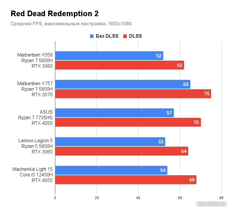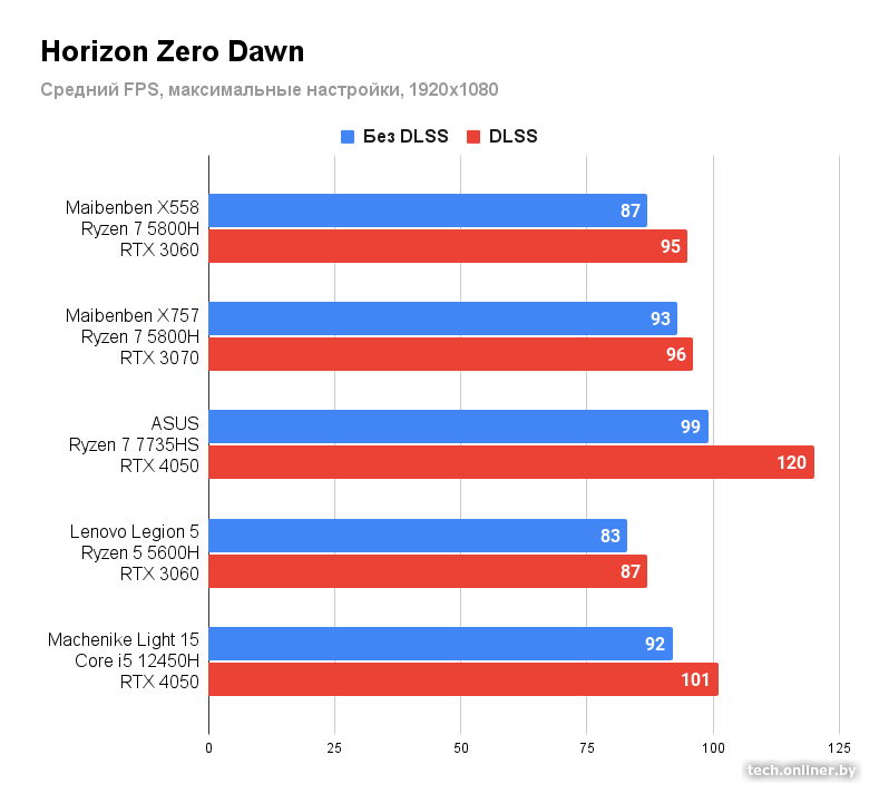 Без DLSS производительность ноутбуков с RTX 4050 оказалась сопоставима с RTX 3060. В зависимости от запущенной игры между ними наблюдались отличия до 10 fps в ту или иную сторону.
