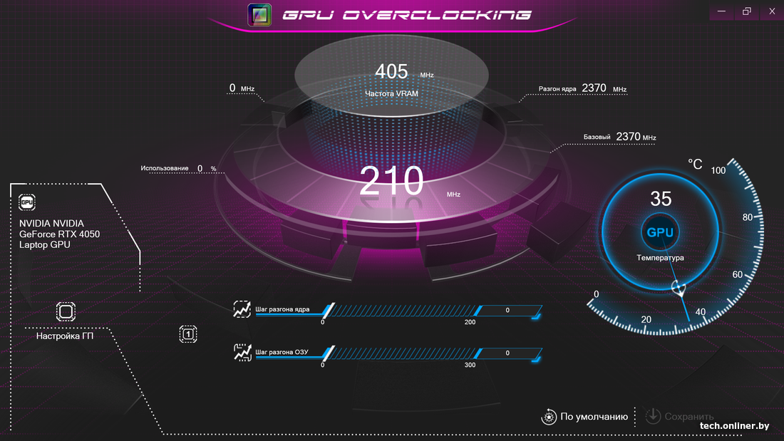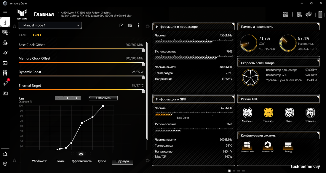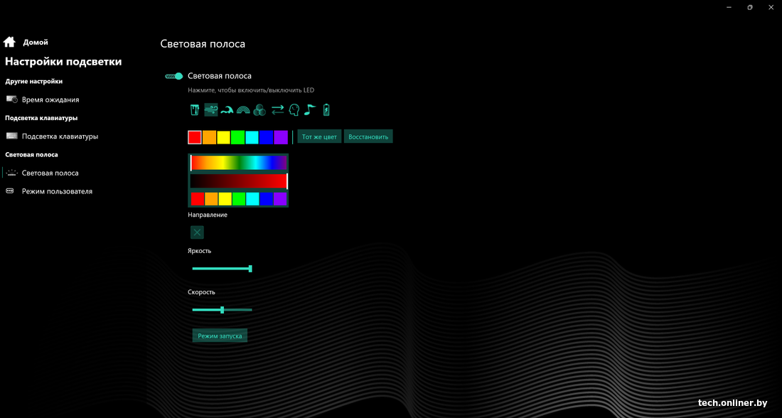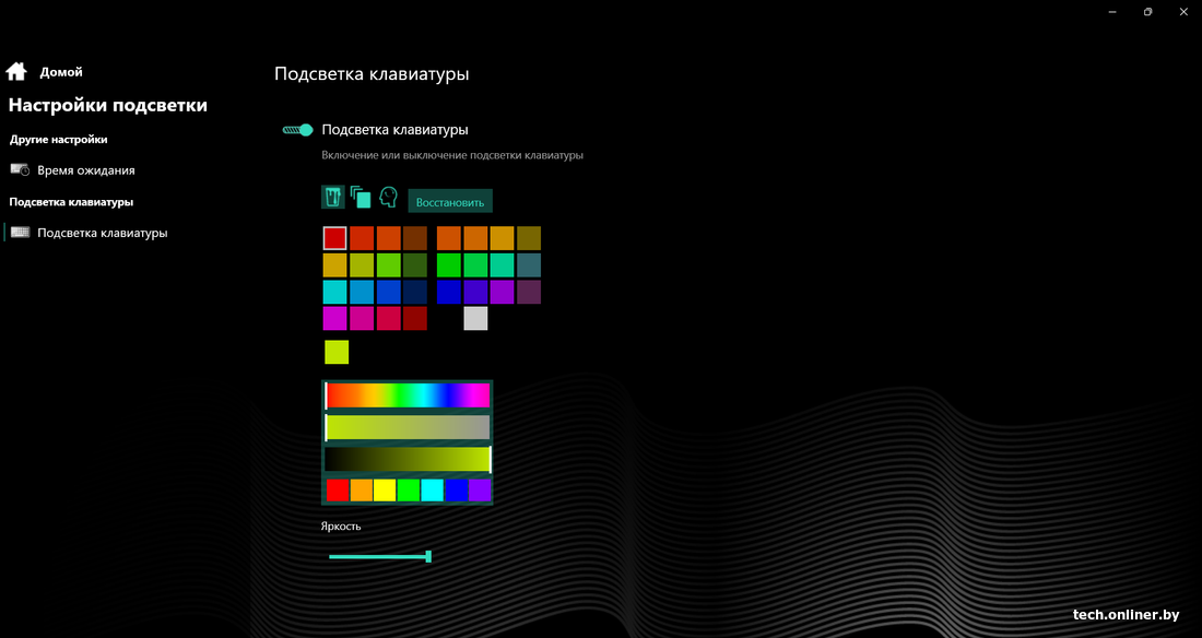 В фирменных приложениях можно настроить профили работы, произвести небольшой разгон компонентов и настроить режимы вращения вентиляторов. Там же можно узнать состояние системы, включая данные температурных датчиков, и, конечно же, можно выбрать цвет подсветки клавиатуры. Глобальные отличия между программами только в дизайне и скорости работы.