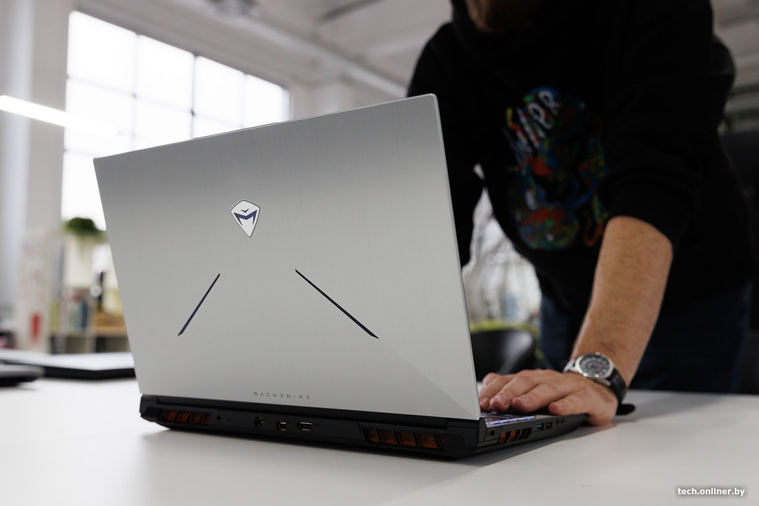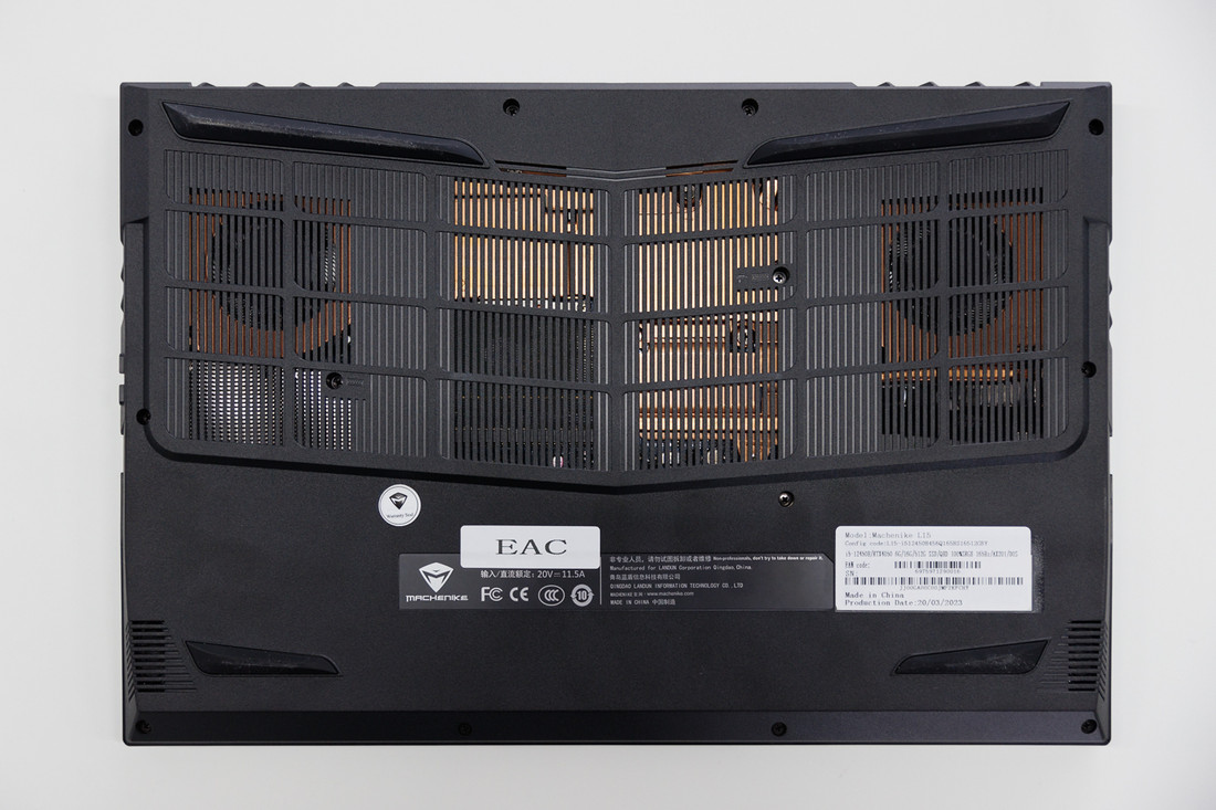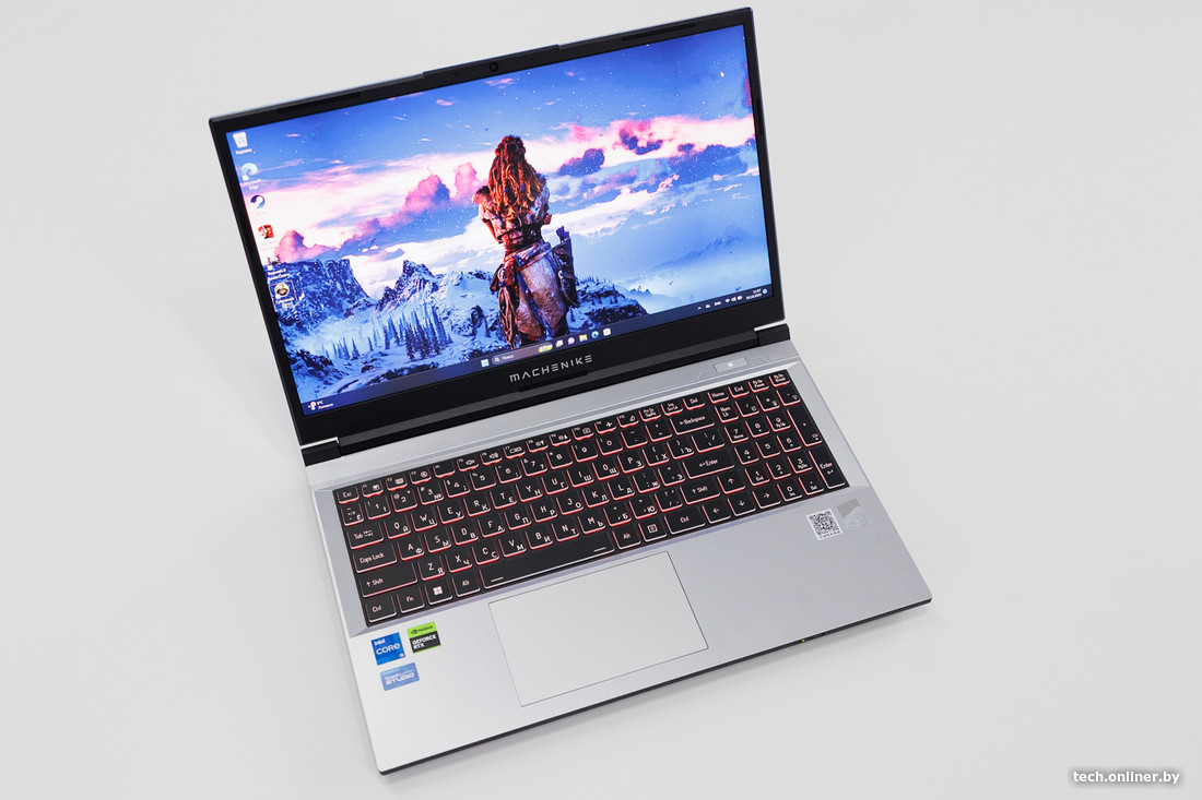 У Machenike Light 15 черный пластиковый корпус и серебристая металлическая крышка с логотипом и декоративными полосками.