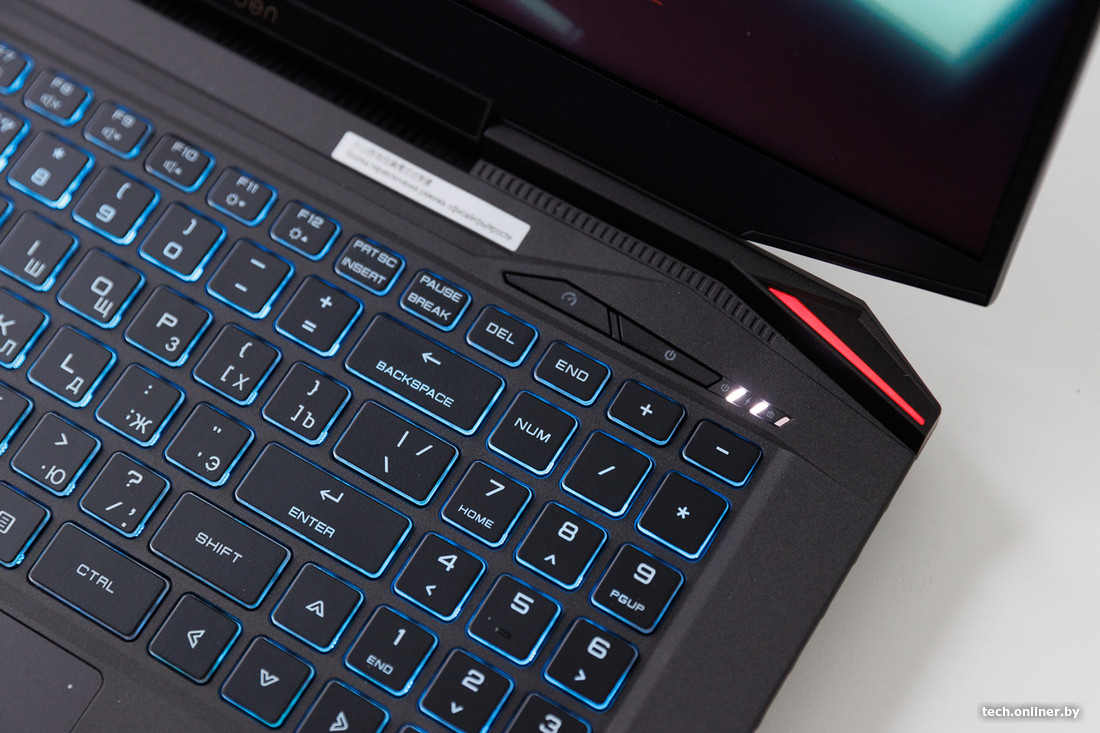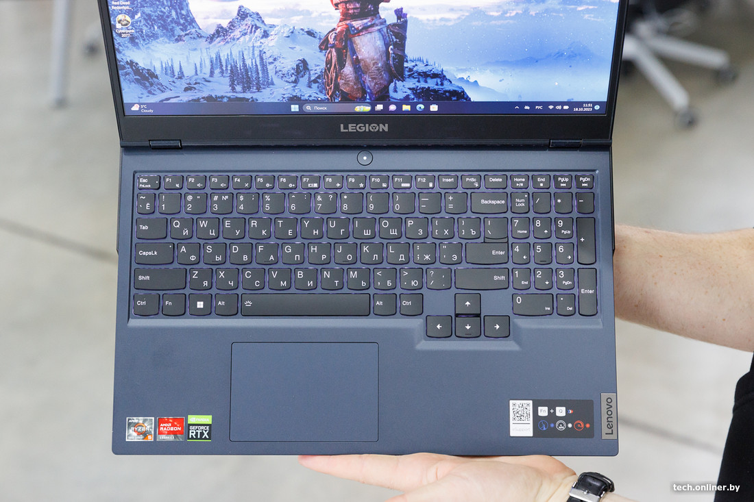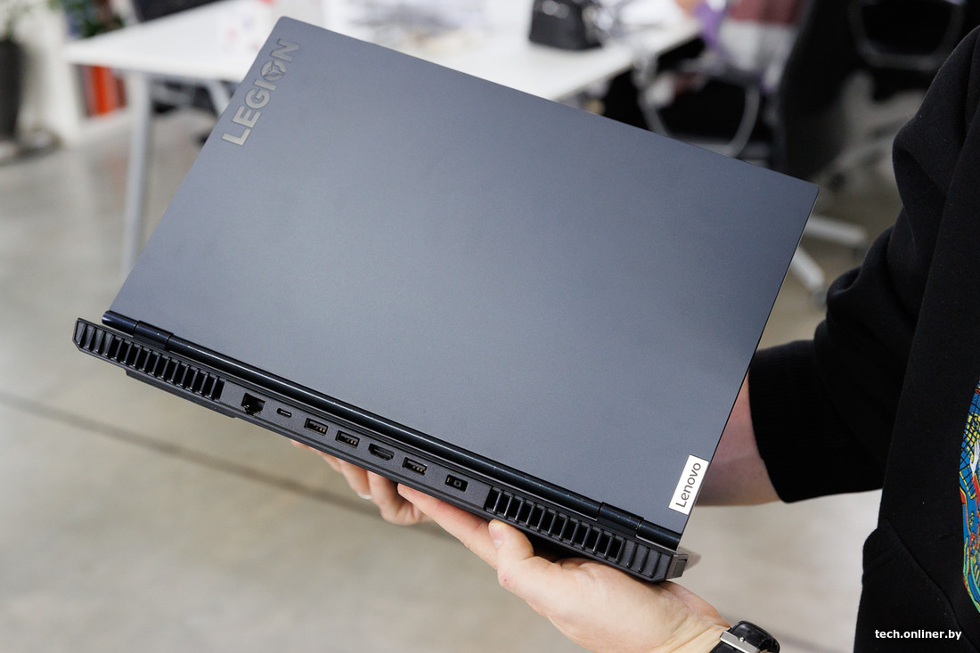 Lenovo Legion тоже выглядит сдержанно по меркам игровых ноутбуков. На темно-синем пластиковом корпусе нет ничего лишнего. Подсветка клавиатуры только белого цвета. Если у вас трипофобия, то лучше не переворачивайте Lenovo Legion вверх дном.