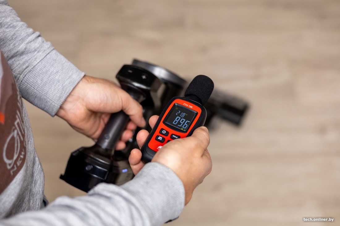 Сила всасывания до 24 000 Па на турборежиме. Емкость аккумулятора 2500 мАч, заряжается около 5 часов, время работы — до часа на минимальной мощности. Есть док-станция с возможностью зарядки. Остаток в процентах можно увидеть прямо на дисплее, что очень удобно.