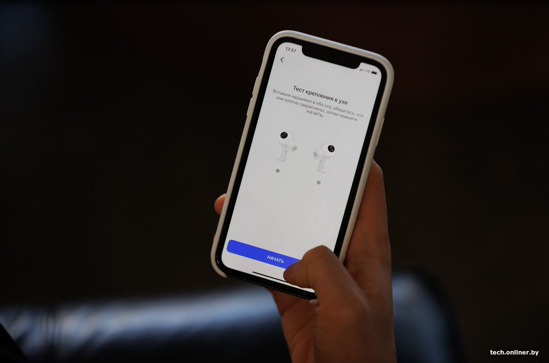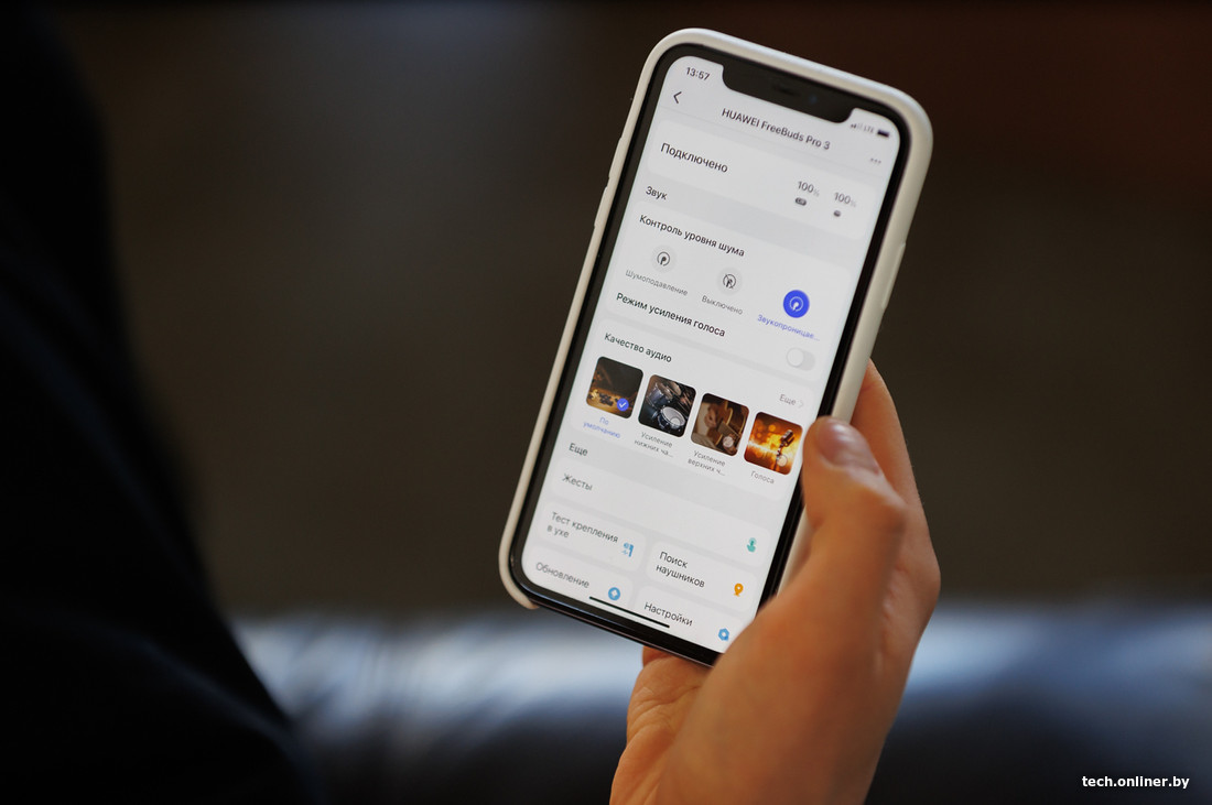 Также можно регулировать уровень шума, который будут допускать наушники. Есть шумоподавление, режим прозрачности, который здесь назвали «звукопроницаемостью», и режим усиления голоса. Последний — прикольная фишка для звонков и видеовстреч: с ее помощью микрофон наушников «цепляется» за ваш голос, выделяя его из общего шума. К слову, микрофон здесь лучше, чем в первых AirPods Pro: собеседник услышит чуть гулкую, но четкую речь, а не словесную мешанину.