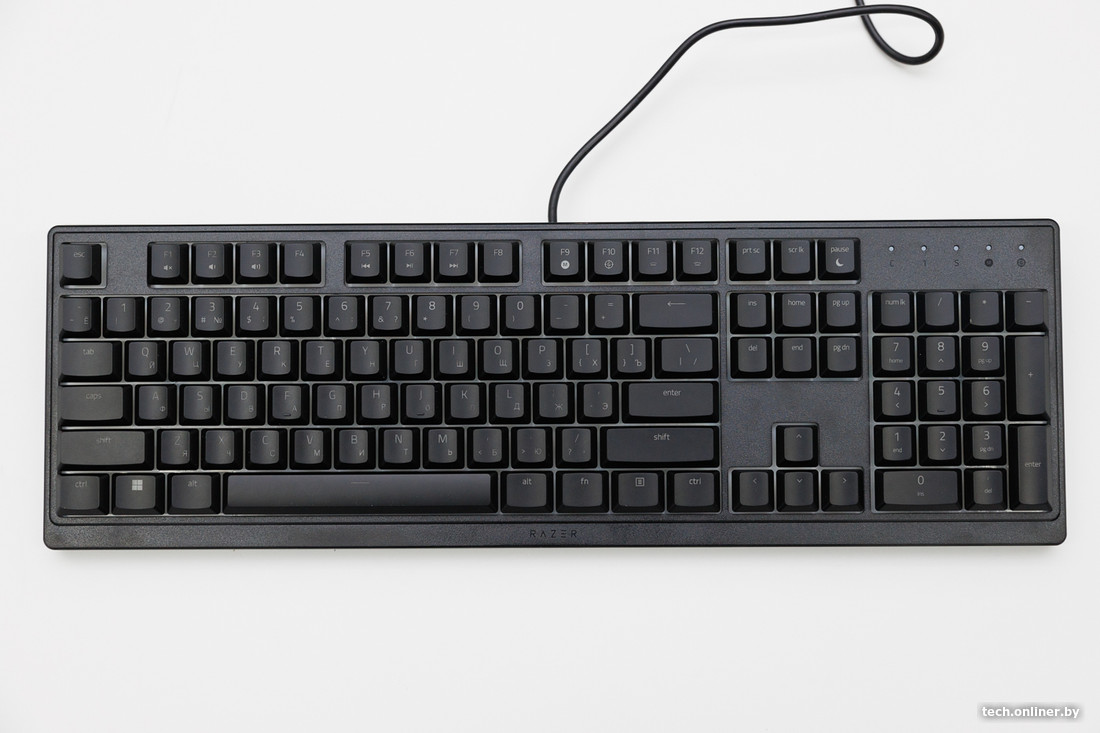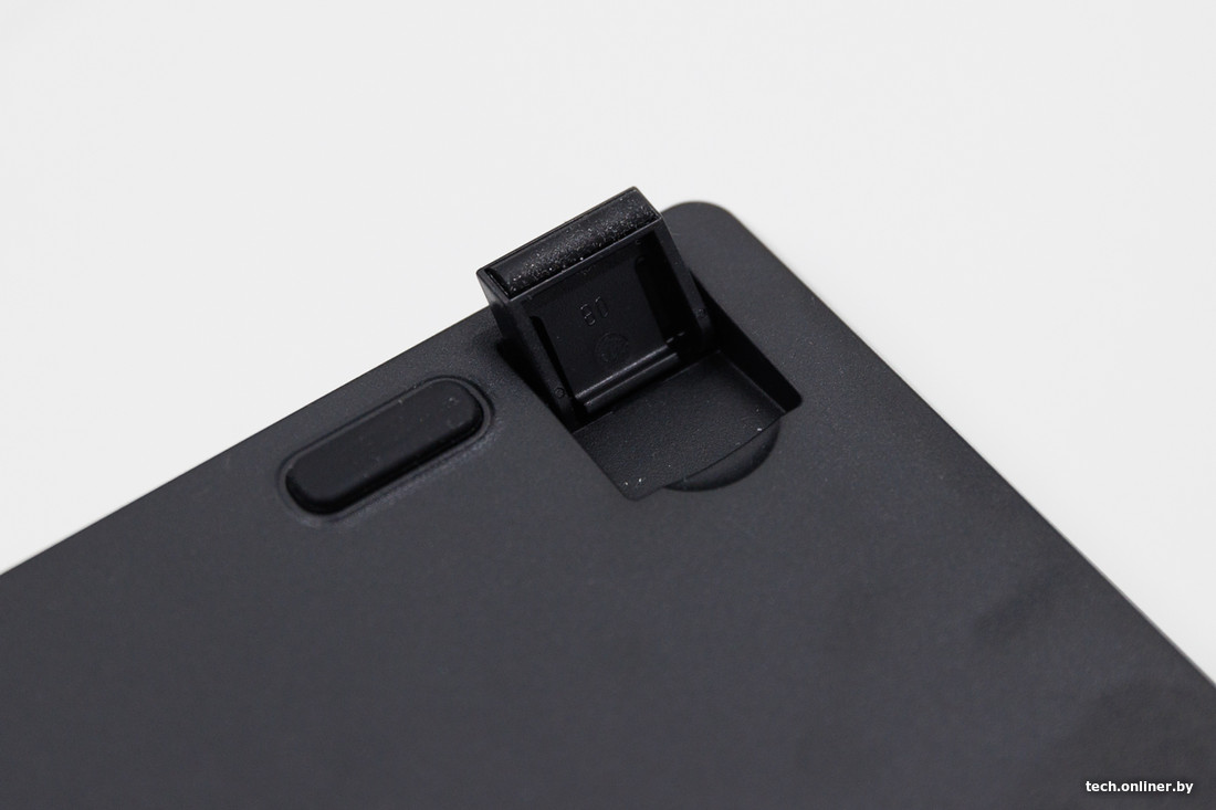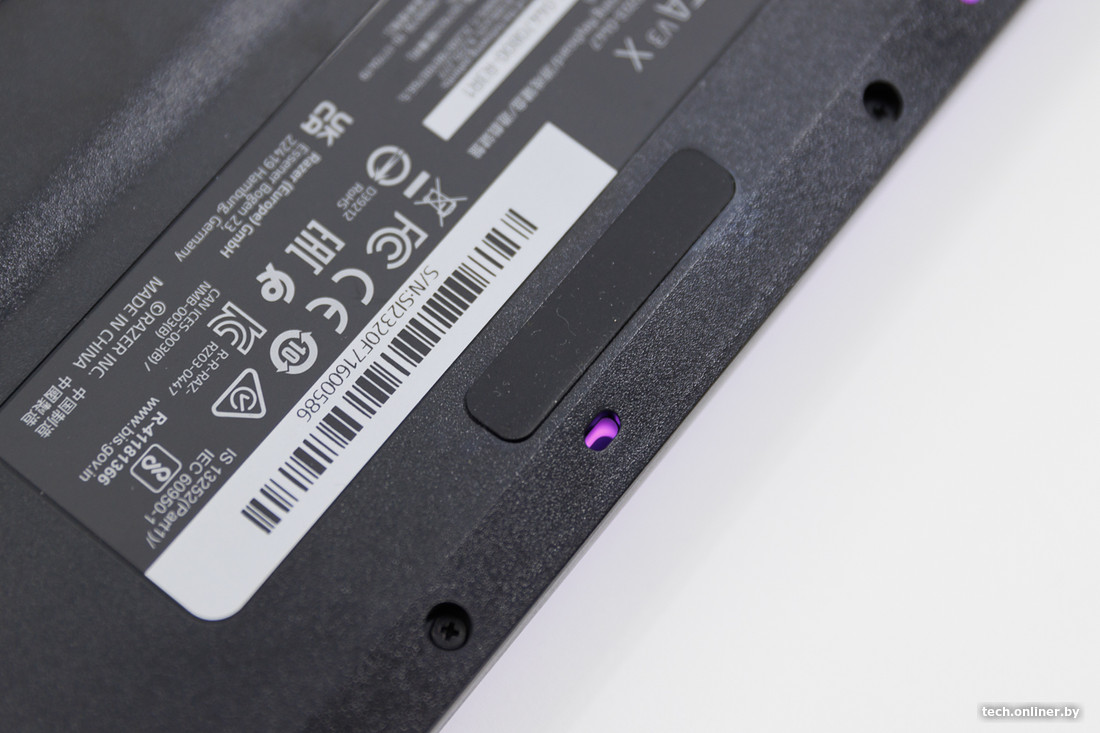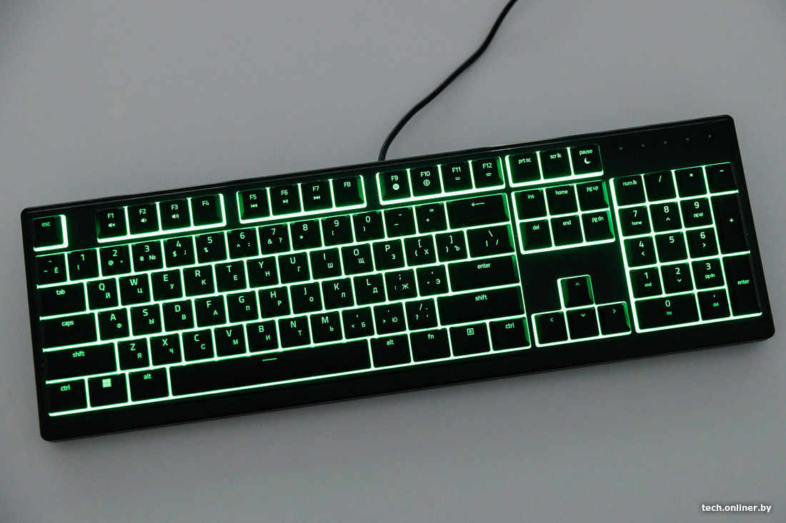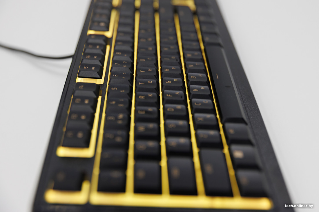С выключенной подсветкой подписи на клавишах остаются полностью читаемыми, шрифты латиницы и кириллицы отличаются: первые нанесены фирменным «жирным» начертанием, вторые — тонким стандартным шрифтом. Кнопки на ощупь кажутся прорезиненными, какое-то подобие софт-тач-покрытия.