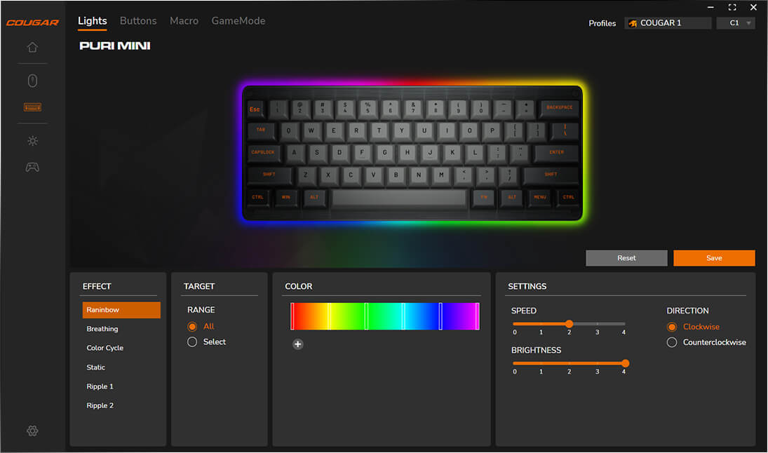 В выключенном виде Cougar Vantar кажется просто стильным устройством, после включения становится похожа на пульт управления «Энтерпрайзом»: золотистая подсветка по всему периметру, кнопки отливают тем же цветом, но буквы на них напоминают символы из компьютера Хищника.