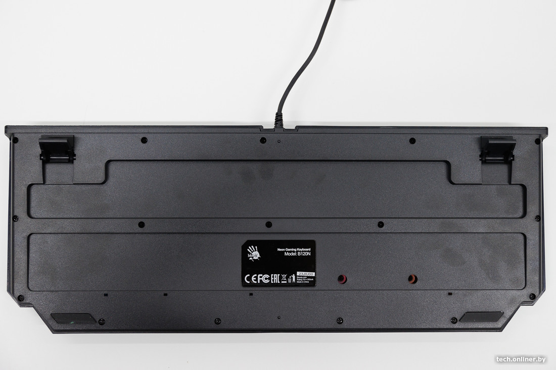 A4Tech Bloody B120N имеет прорезиненные ножки, а вот складные подставки — нет. Поэтому на матерчатом коврике клавиатура может «поползти», не сильно она прилипает и к глянцу. Вес примерно в 790 граммов не влияет на наличие «шевеленки», это скорее вопрос к ножкам.