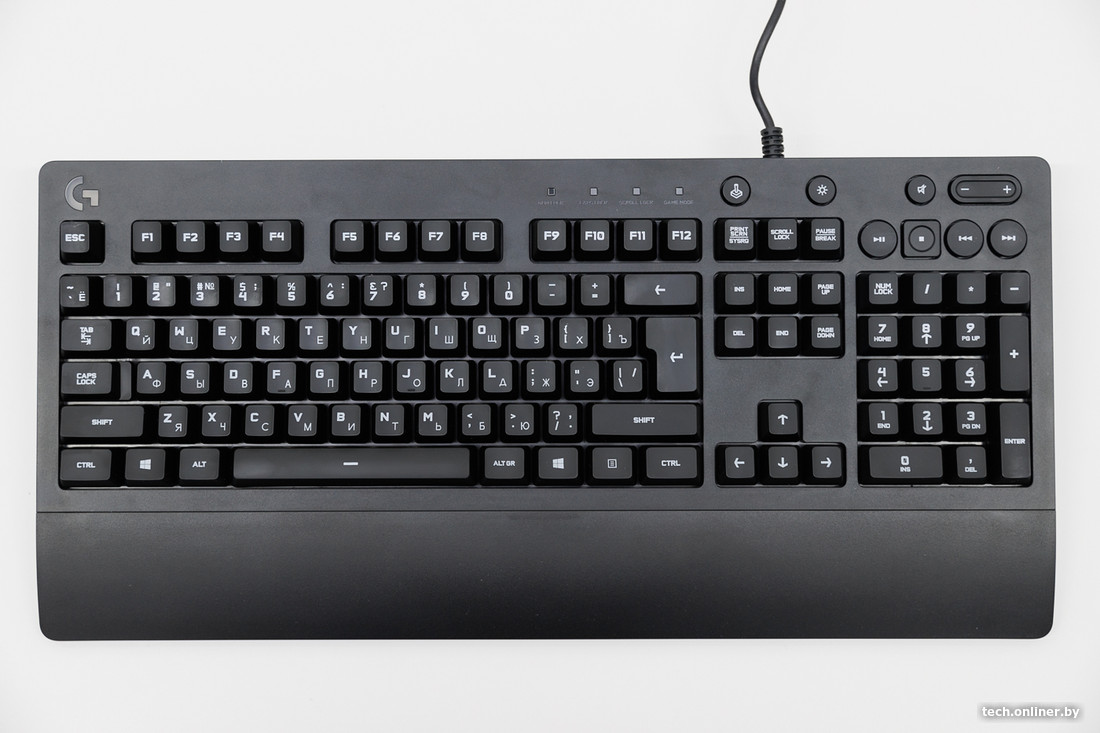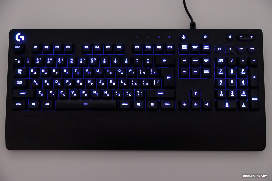 В отличие от двух моделей, описанных выше, в клавиатуре Logitech подсветка реализована только для символов кнопок. Однако ее отличительной особенностью скорее являются весьма ощутимые габариты. Устройство получило интегрированную подставку под запястья, плюс верхняя панель, что над F-кнопками, широкая и с дополнительными элементами.