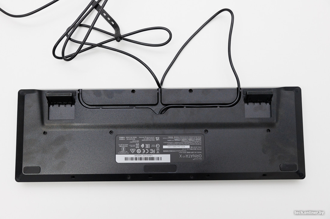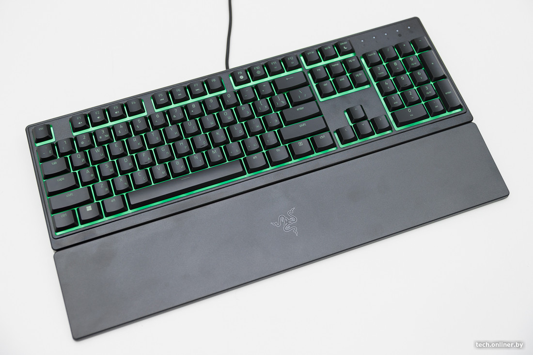 Второй на стол попала Razer Ornata V3 X. Это также проводная клавиатура с неотсоединяемым проводом (в корпусе есть кабель-каналы, чтобы отвести «шнурок» в сторону). Мембранная, с подсветкой, полноразмерная, профиль кнопок заметно ниже, чем у A4Tech Bloody B120N, за счет классической конструкции корпуса, плюс отличается ход клавиш. Заявленная частота опроса как у Razer Ornata V3 X, так и у варианта от Bloody — 1000 Гц. У Ornata V3 X имеются двухпозиционные складные ножки, поднимающие заднюю часть клавиатуры, а в комплекте также идет подставка под запястья. Она никак не крепится к устройству, ее просто нужно уложить рядом.