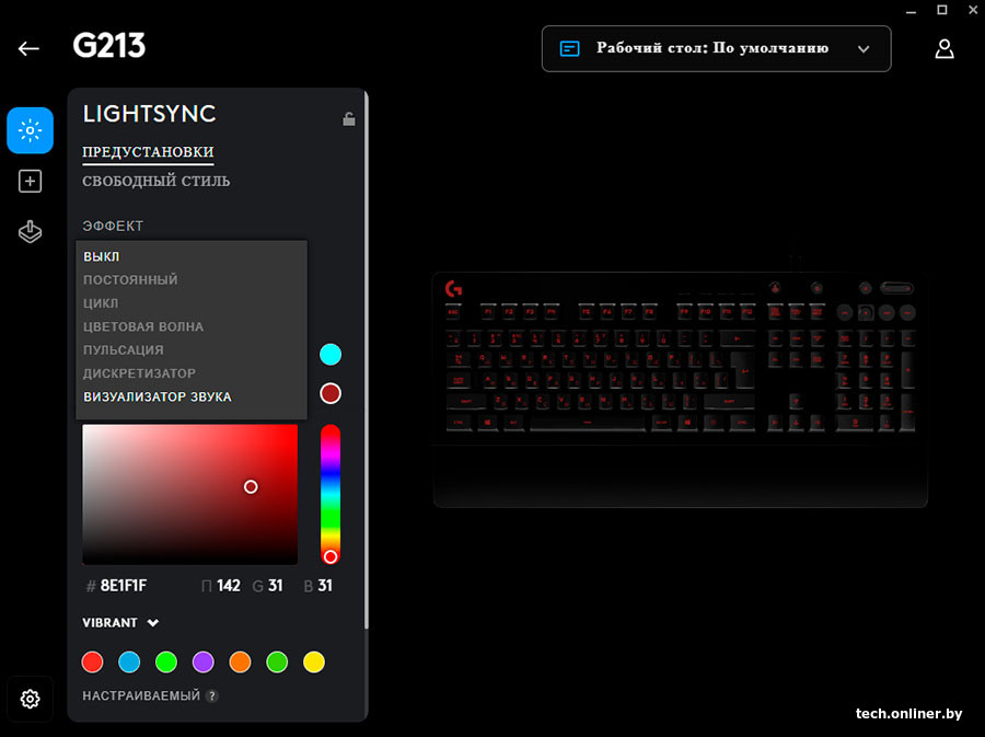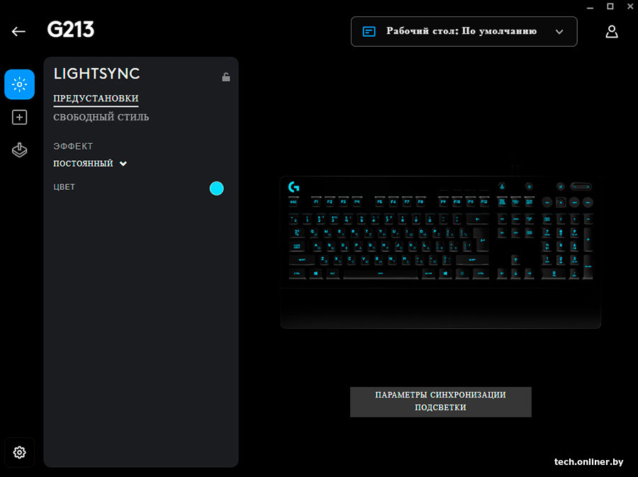 Управлять пятизонной подсветкой с клавиатуры нельзя — потребуется фирменное приложение Logitech G-Hub. За годы своего существования это ПО не стало лучше и понятнее, но пробраться к нужным настройкам можно: доступны разные режимы ее работы, в том числе «визуализатор звука» (клавиатура пульсирует в такт). А вот менять яркость нельзя. Также имеется возможность создавать макросы и отключать в игровом режиме ненужные кнопки.