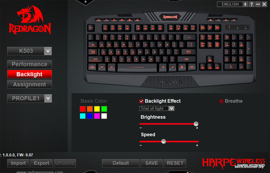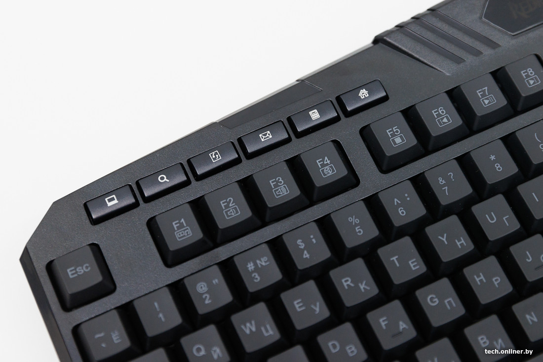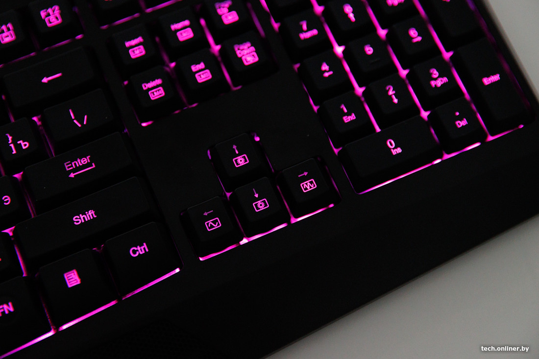 Подсветка однотонная, полностью равномерная, однако буквы на минимальных ее уровнях просвечиваются лишь слегка, основной поток света идет на латиницу. На высоких уровнях подсветки выжигает глаза. Есть сочетания клавиш для записи макросов на лету, регулировки яркости и включения игрового режима.