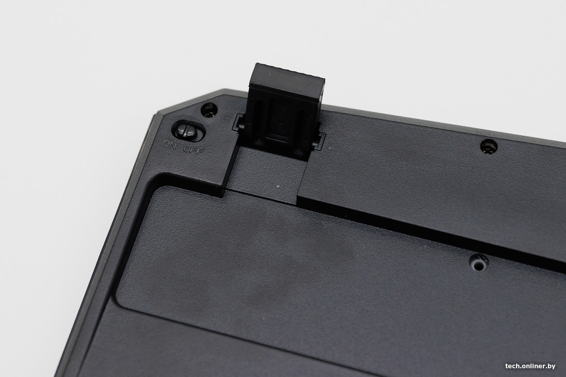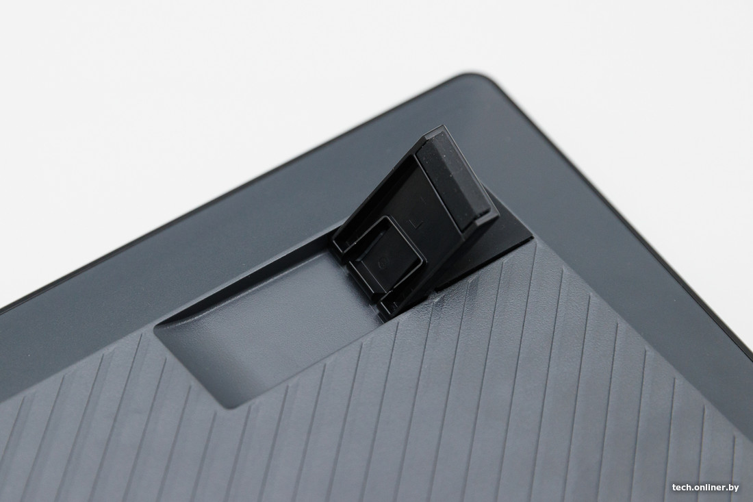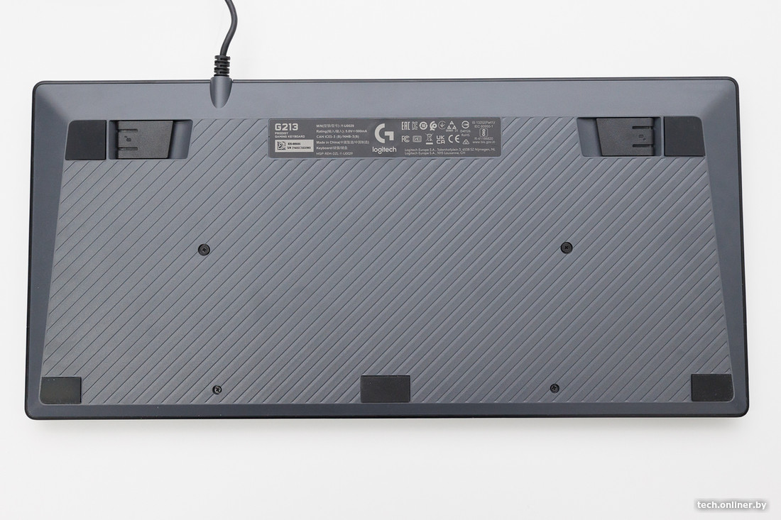 На столе Logitech G213 Prodigy держится устойчиво, не скользит: тому способствуют широко расставленные прорезиненные ножки, но чуть хуже клавиатура хватается за матерчатый коврик. Вероятно, это связано с конструкцией откидных лап, которые открываются вбок, а не назад, как у остальных клавиатур. Вес — килограмм.