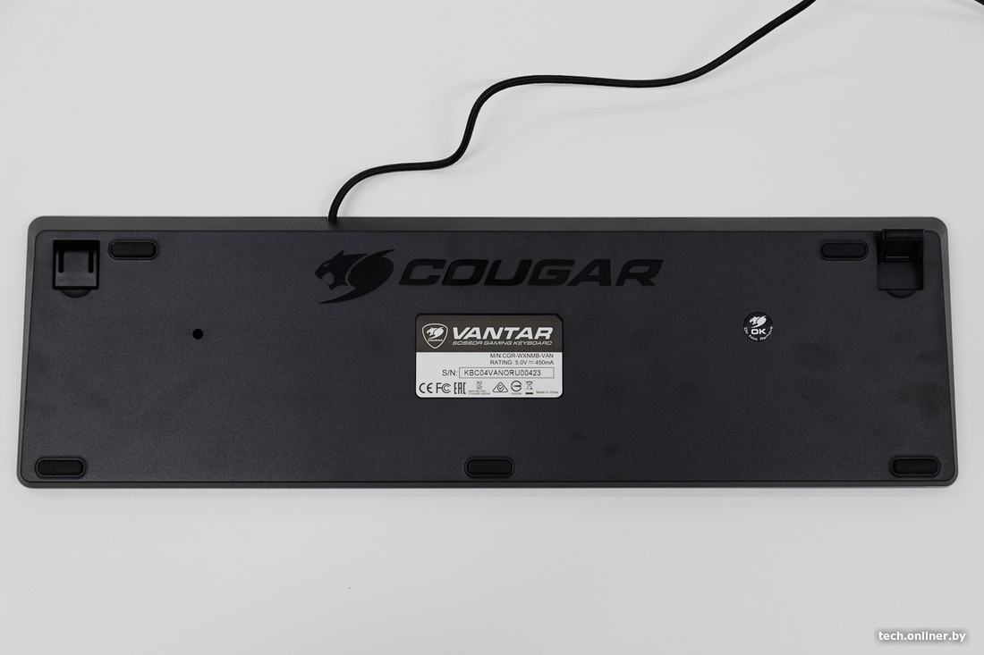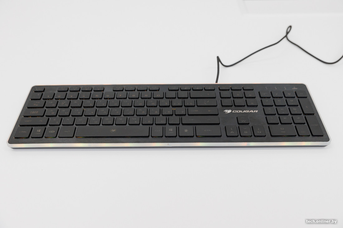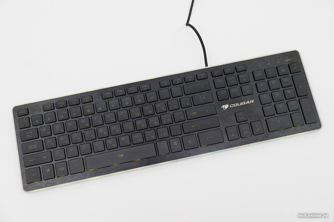 Последней в списке стала клавиатура Cougar Vantar. Самая низкопрофильная в подборке, да и вообще ее толщине позавидует «макбук» (на самом деле нет, но выглядит очень тонкой). Клавиатура компактная, полноразмерная со всем набором кнопок, проводная и мембранная. Кабель внешне самый богатый и качественный с нейлоновой оплеткой, хоть внутри и жестковат.