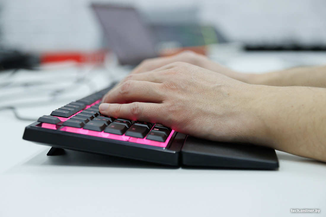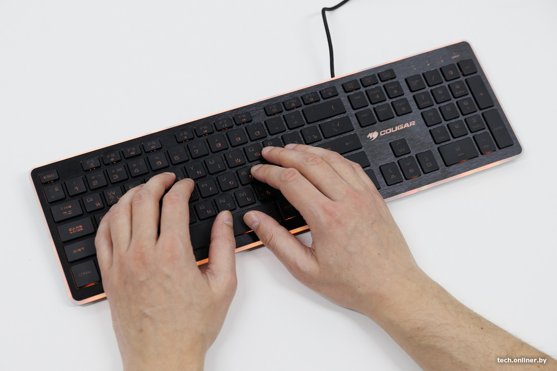 С точки зрения работы с текстом Cougar Vantar кажется самой удобной в нынешней подборке (почти идеальной): низкий профиль снижает вероятность ошибок, клавиатура тихая, но с четким тактильным откликом. В играх также проблем не возникло. Как она поведет себя в течение длительного времени, сказать сложно: судя по отзывам владельцев устройства, могут возникнуть вопросы к креплению кнопок. Также остается нюанс с подсветкой: если вам регулярно нужно поглядывать на буквы, в первое время будет сложно сориентироваться, а без подсветки символы практически не видны.