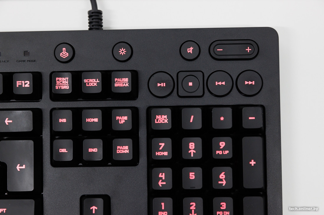 Кнопки Fn у Logitech G213 Prodigy нет, но есть отдельная «качелька» для громкости и отключения звука, управления плеером, отключения подсветки и активации игрового режима. Вот они-то и заняли место (а в отместку клавиатура займет немало места на столе). Из минусов — то ли модель особая попалась, то ли это фишка такая: кнопка увеличения громкости требовала вдавливать ее с силой, в противном случае не срабатывала.