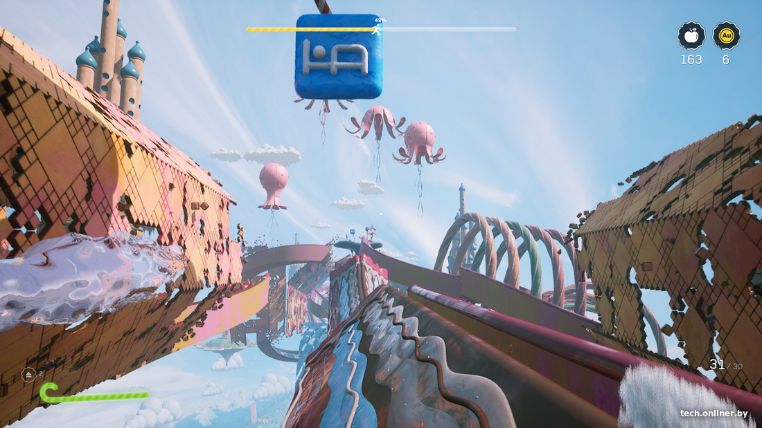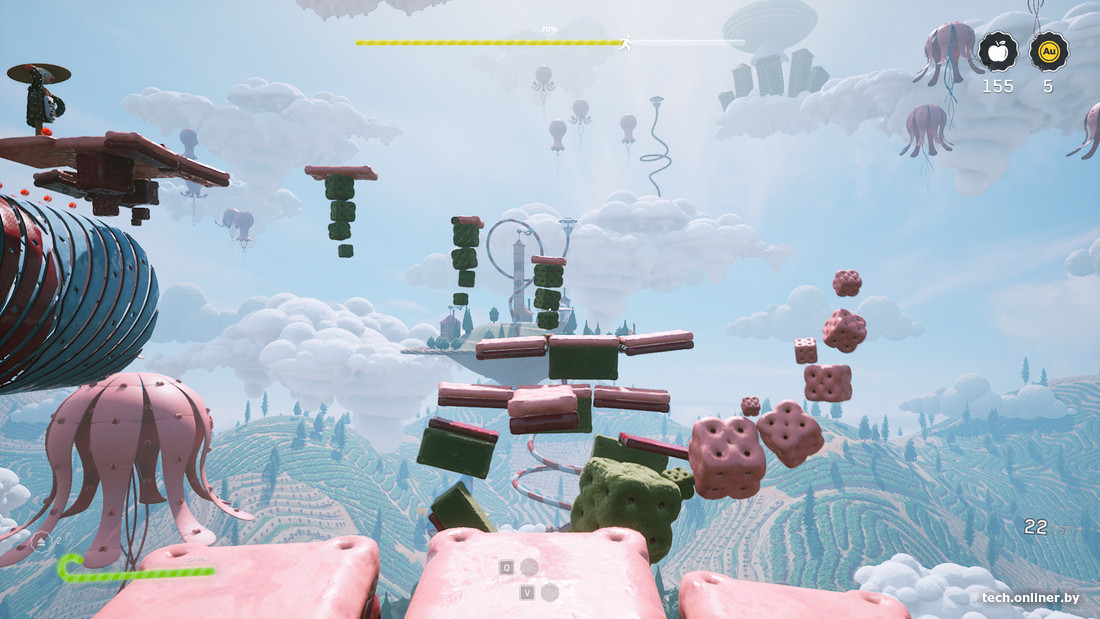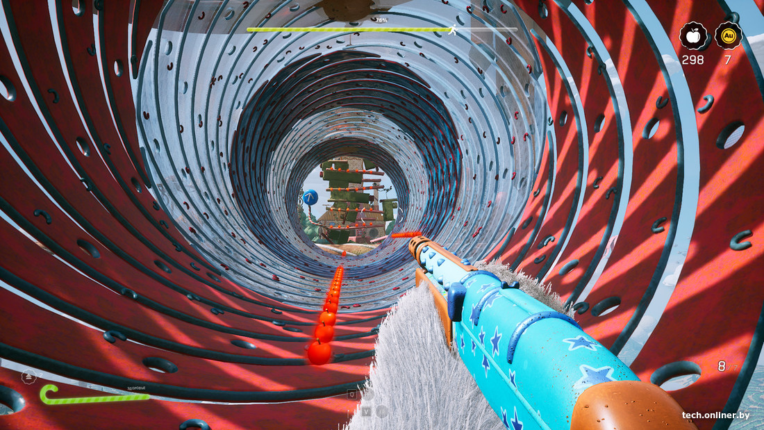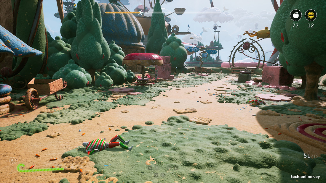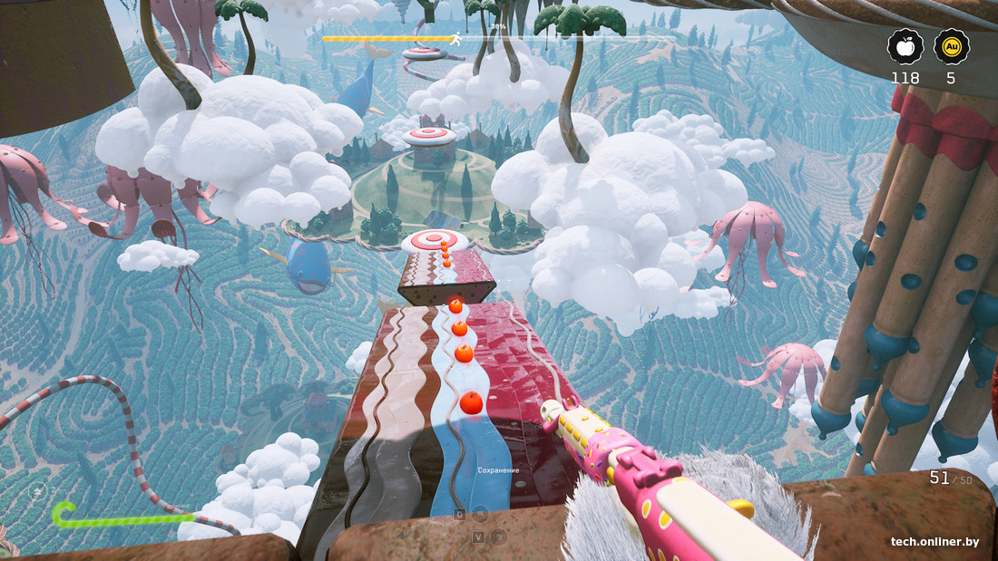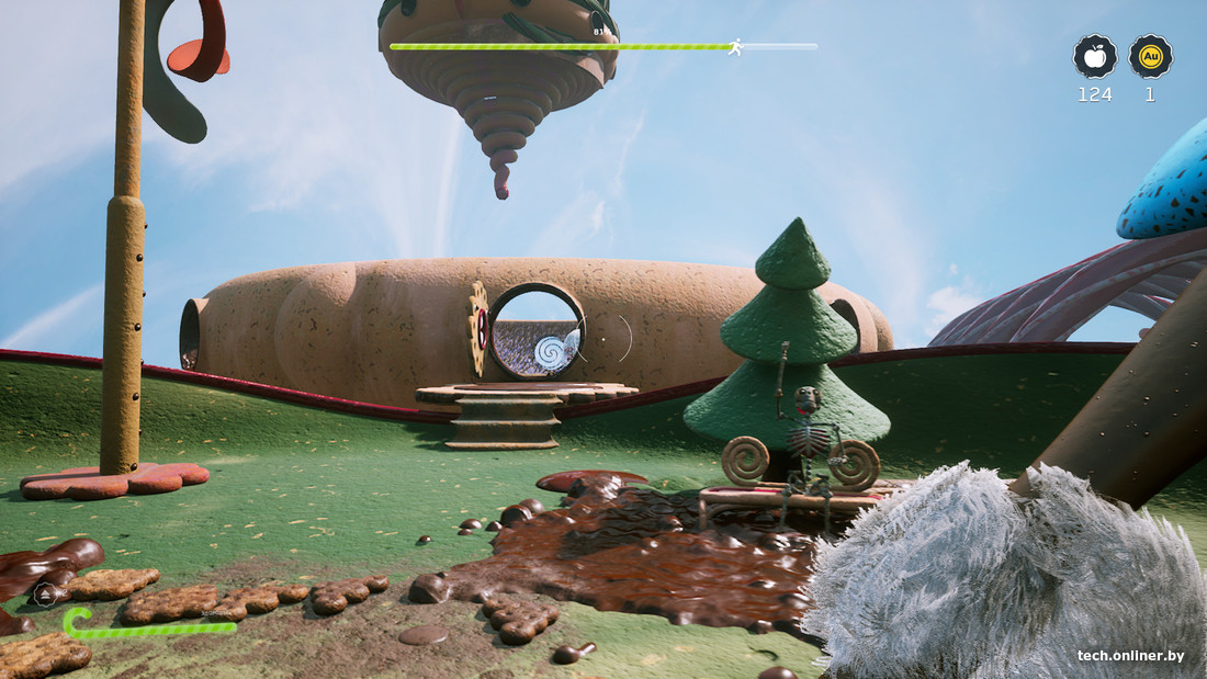 Второй тип заданий кажется еще более примитивным: есть установленные друг за другом мосты и трамплины, по которым шерстяной герой скользит, собирая «яблочки» и объезжая препятствия. Звучит просто, однако поверхности находятся в разных плоскостях, могут изгибаться, внезапно обрываться и даже закручиваться в кольцо (а еще есть смертоносные преграды). Решение — поддерживать скорость, выбирать оптимальный маршрут и несколько раз проходить один и тот же отрезок между чекпойнтами. С первого раза точно не получится.
