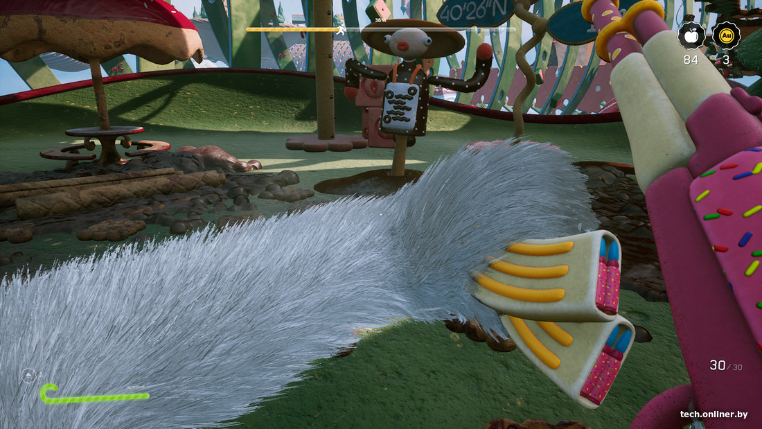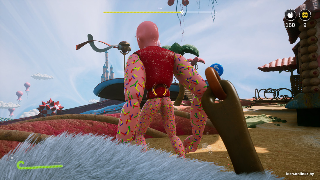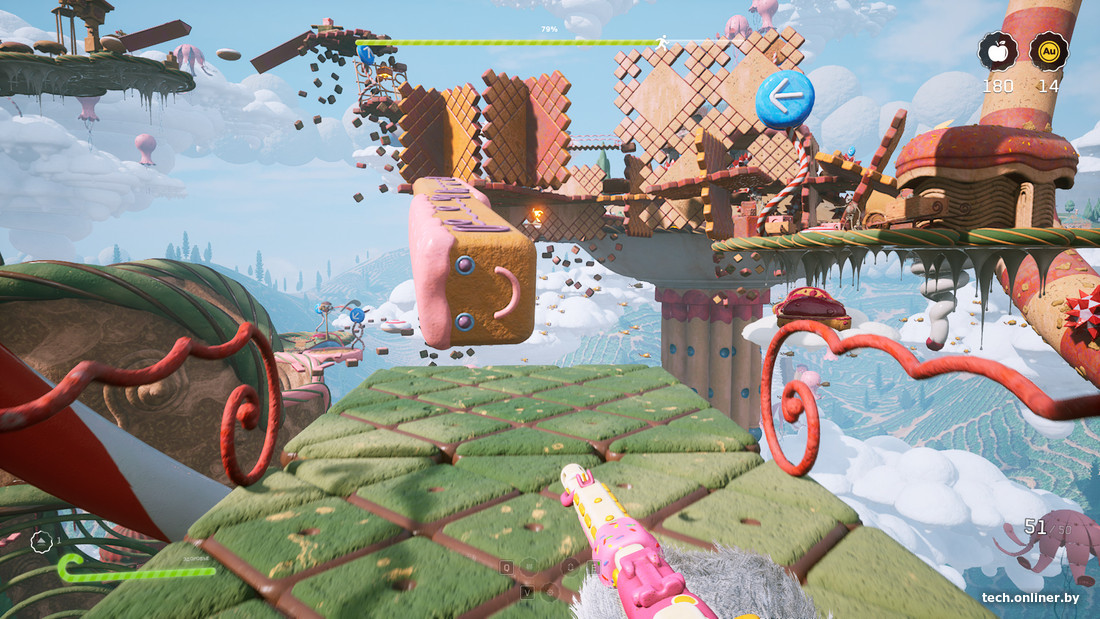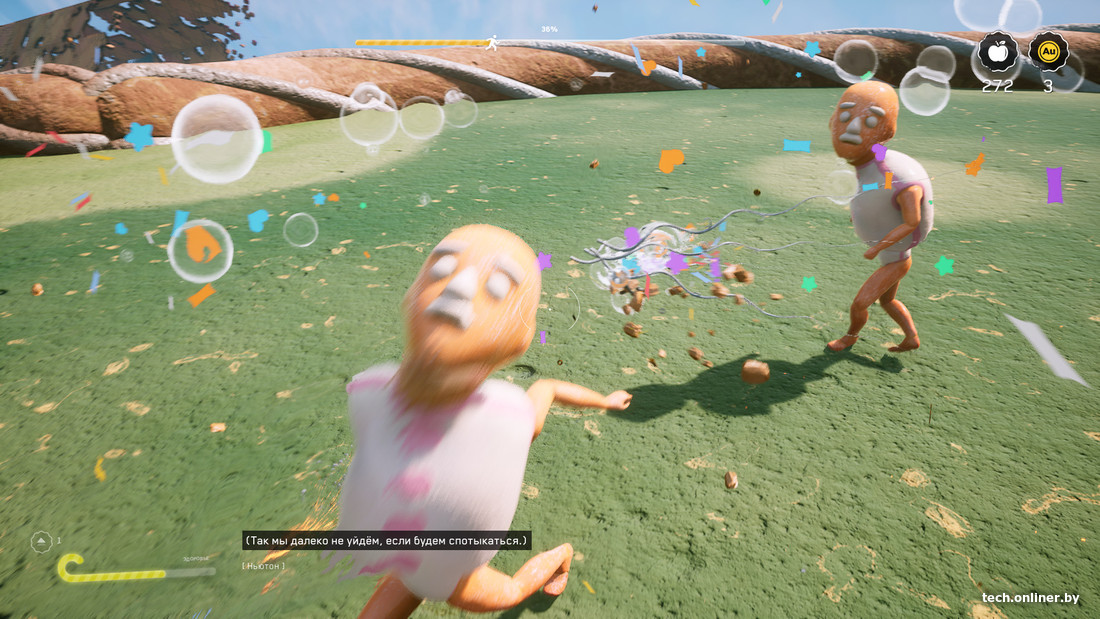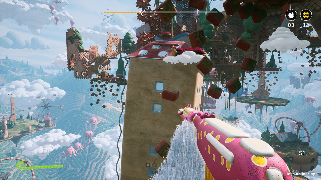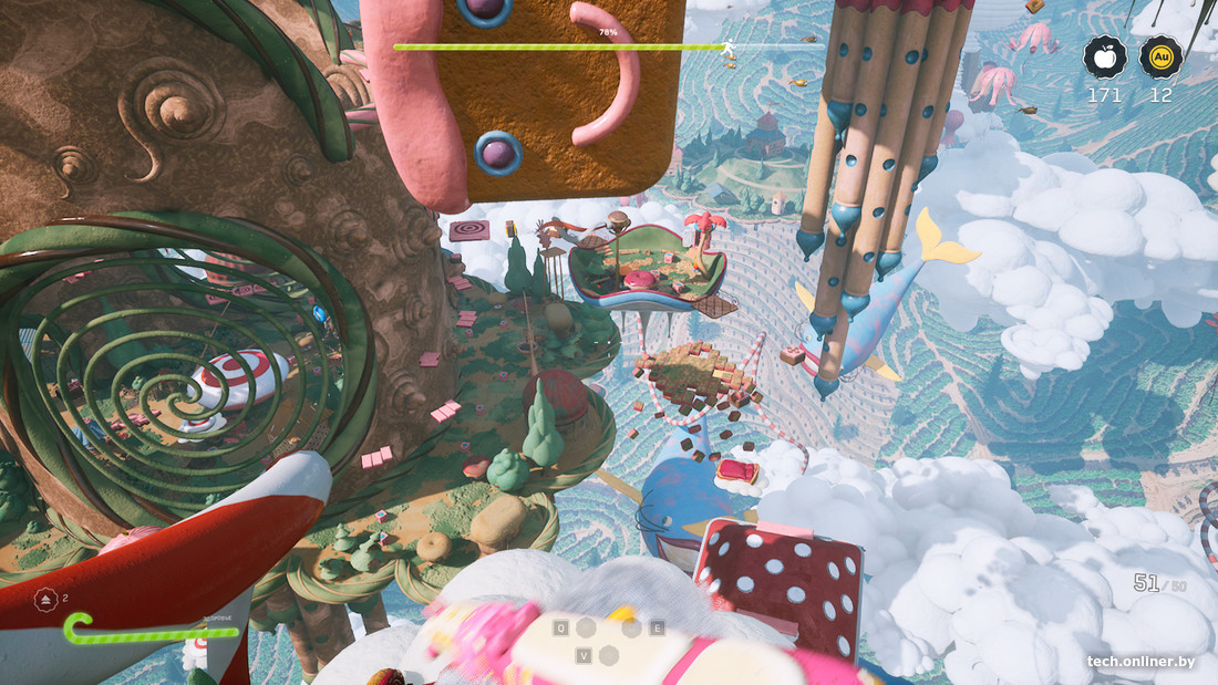 Второй тип заданий кажется еще более примитивным: есть установленные друг за другом мосты и трамплины, по которым шерстяной герой скользит, собирая «яблочки» и объезжая препятствия. Звучит просто, однако поверхности находятся в разных плоскостях, могут изгибаться, внезапно обрываться и даже закручиваться в кольцо (а еще есть смертоносные преграды). Решение — поддерживать скорость, выбирать оптимальный маршрут и несколько раз проходить один и тот же отрезок между чекпойнтами. С первого раза точно не получится.
