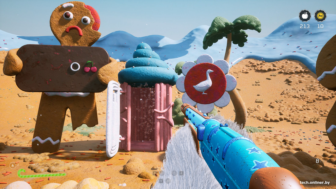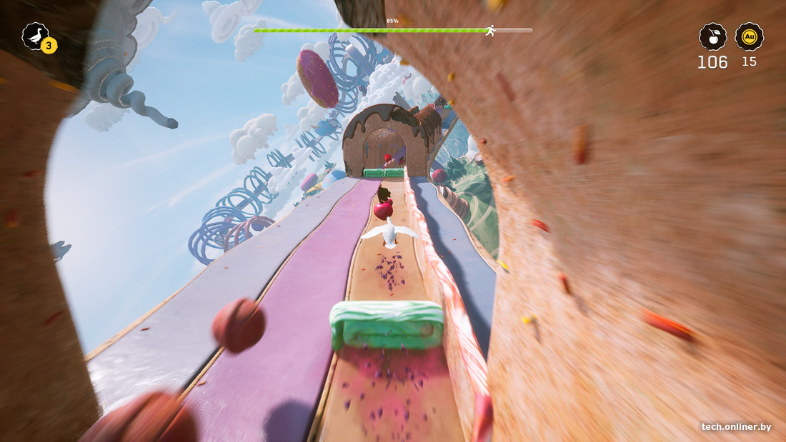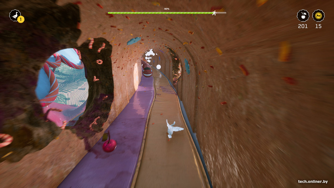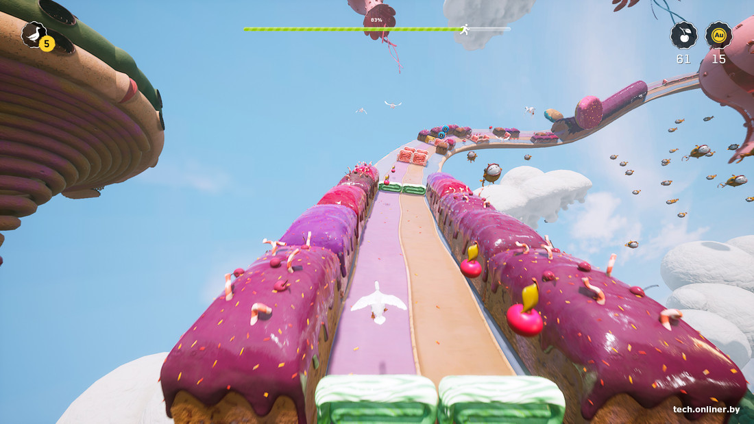 Боли добавляют пальцевыворачивательные комбинации — встречаются как раз на уровне с гусем. Выглядит это так: на коротком отрезке в зависимости от типа преграды в разной последовательности необходимо чередовать Q, E, «Пробел»+E, «Пробел»+Q, S+E и S+Q, «Пробел» и «Право»—«Лево». Без подсказок, конечно. Спасение, судя по всему, в геймпаде, так как понятно, что делать. Вопрос — как с этим справиться ПК-боярам. Если получится, можно, гогоча от радости, нестись по скользкой дорожке. Много раз по одной и той же.