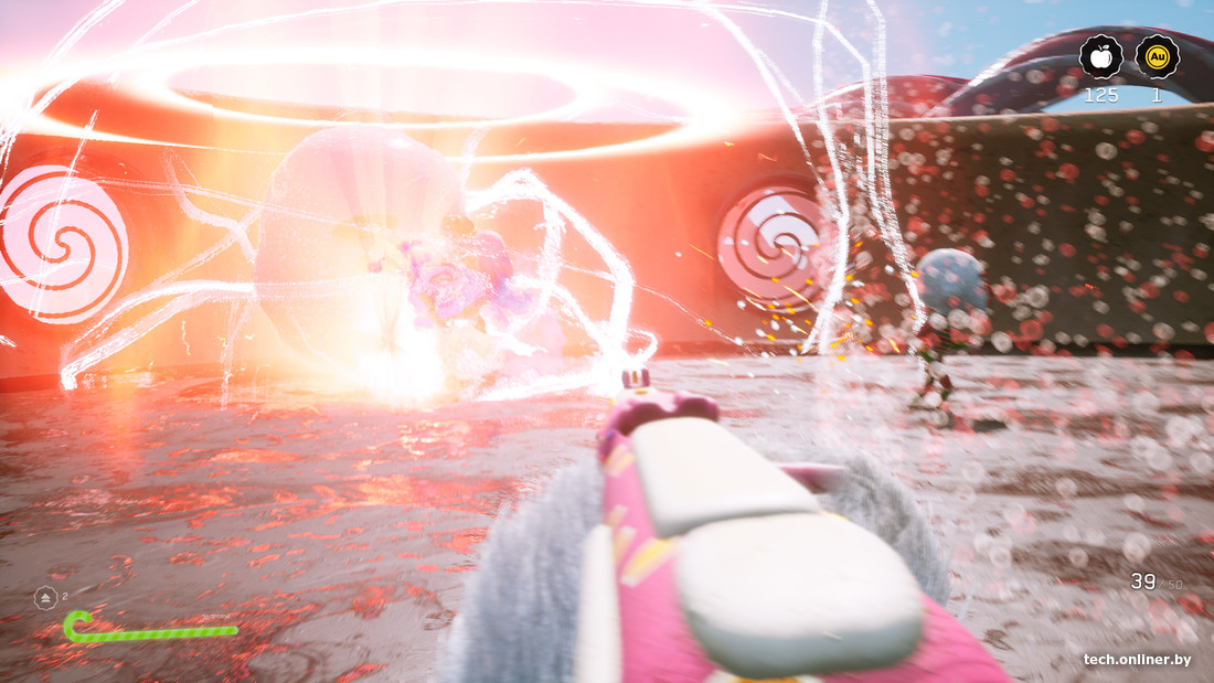 Что касается арсенала, он тут для галочки: можно собирать красные яблоки, которые представляют собой местную валюту, и тратить их в автоматах рядом с точками сохранения (золотые монетки тоже, но для будущей «косметики»). Определенное разнообразие имеется, однако оно неочевидное. Можно пройти игру, купив вначале автомат в дополнение к молоту, и этого достаточно, разве что апгрейд не помешает. Здесь же случайным образом (оружия это тоже касается) можно получить улучшение умений или какие-то иные игровые «плюшки».