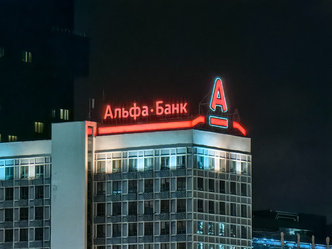 Но когда приходит ночь, Huawei P60 Pro уверенно забирает звание лучшего. Посмотрите: тут даже видны неоновые трубки вокруг буквы «А», тогда как iPhone 15 Pro Max опять перегрузился красным каналом, показав ужасные артефакты. Huawei чуть сместился в оранжевый оттенок, однако мы можем видеть и объем подсвеченных букв, и белые неоновые трубки, обрамляющие букву. При этом небо выглажено от шумов, тогда как у конкурентов они есть. Honor в целом дал неплохую картинку, но посчитал шумом текстуры под окнами и зачистил их. iPhone вроде бы сохранил детали, но оставил странные черные пятна-артефакты.