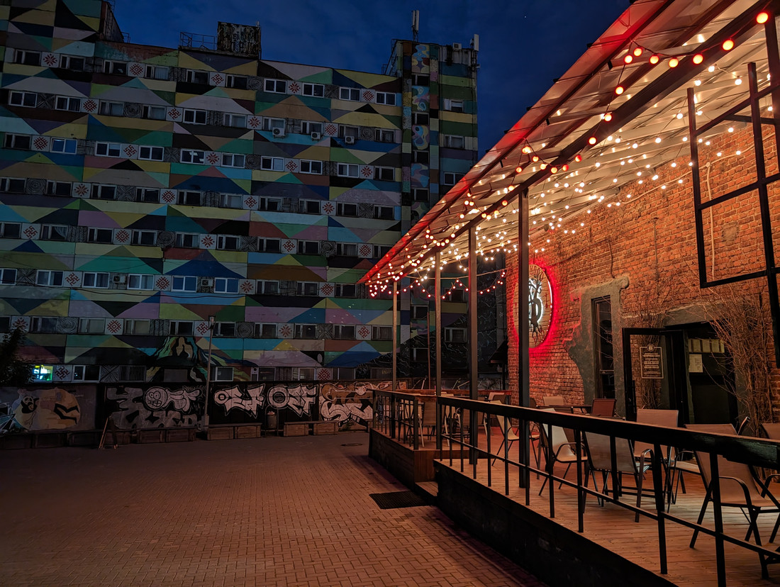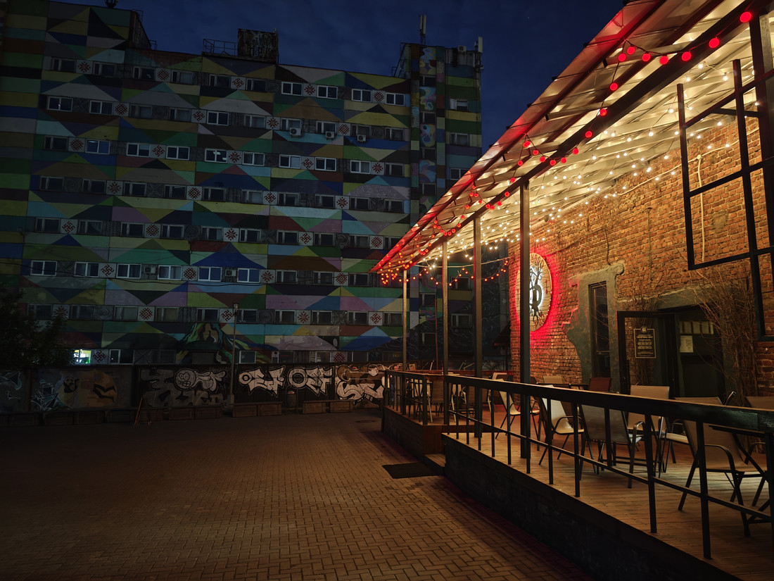 Вечернее смешанное освещение способно свести с ума любую камеру. И они сошли. Pura 70 Ultra сделала сцену очень насыщенной, с кислотными цветами. У Samsung получились черные точки-артефакты на лампочках-гирляндах. Наилучшая резкость кадра получилась у Google Pixel 8 Pro.