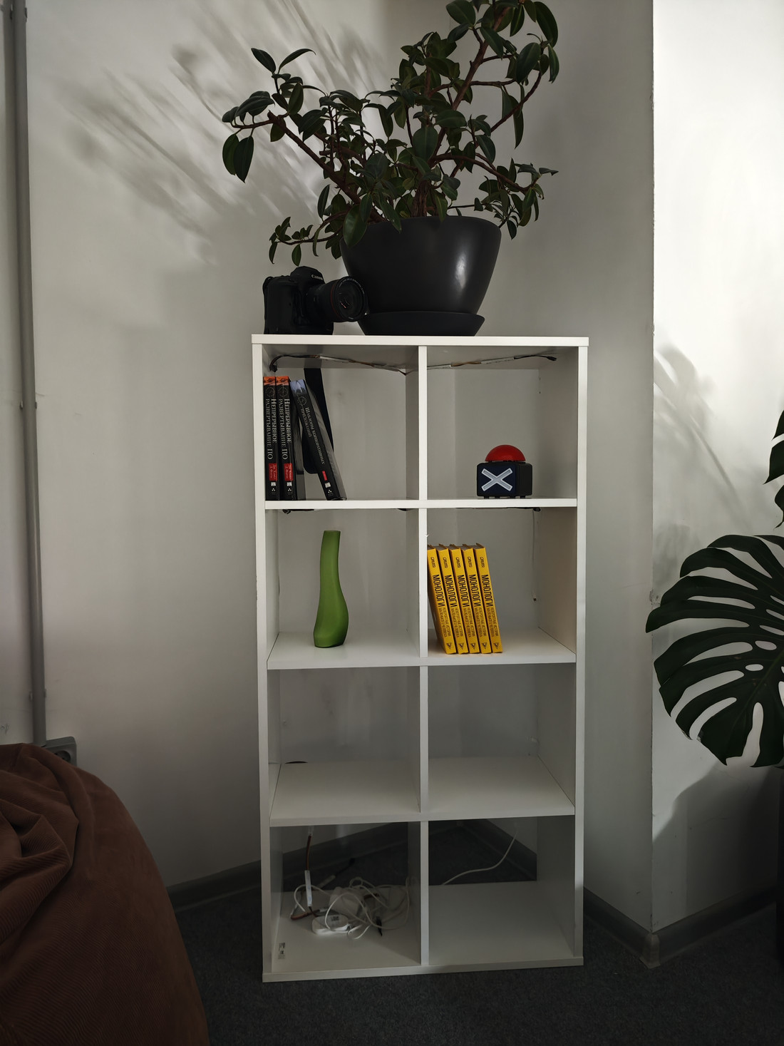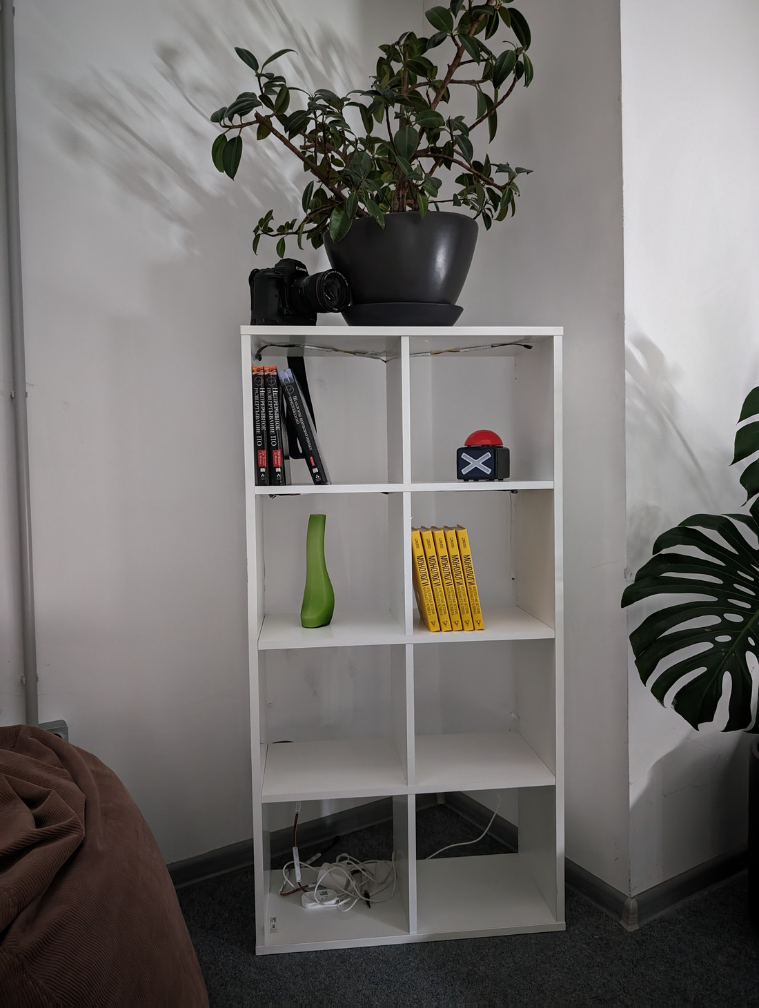 Эта сцена освещается лишь небольшой оконной щелью, и мы не можем различить совершенно никаких цветов невооруженным глазом. Наиболее удобно снимать в темноте на iPhone: он быстро собирает свет, и легко выстроить композицию, даже если темнота кромешная. Но первое место за ночную съемку мы бы отдали Xiaomi: четкие линии шрифта на книгах, а на фото камеры — единственное заметное красное кольцо и легче всего угадать надпись на объективе.