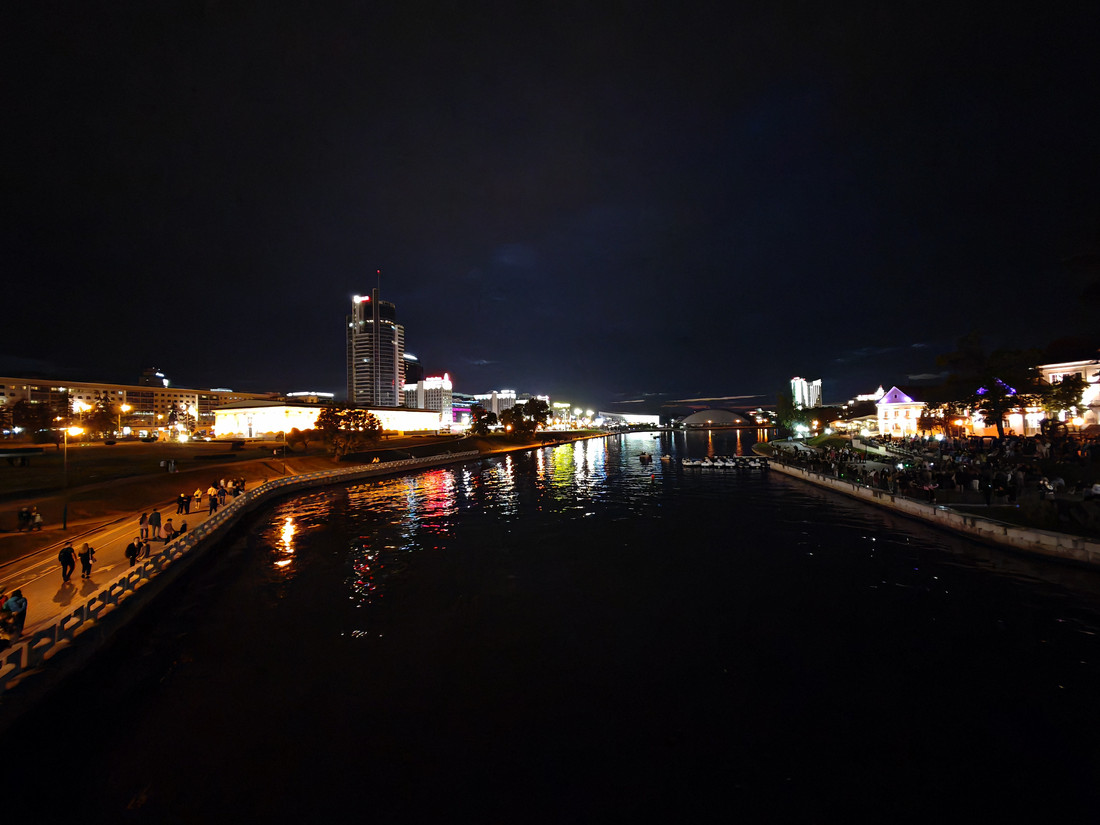 Этому кадру порадовались все комары в парке Янки Купалы. Как видим, одни смартфоны выбрали закрыть диафрагму и получить звездочки, другие этого не умеют и просто дают размытое пятно. На наш взгляд — лучше всех сцену отработал Xiaomi 14 Ultra. Тут и летние оттенки заката, и солнце, и нет потери контраста. Samsung идет вторым — тут еще больше теплоты заката, но солнце пятном, а из-за «зайчика» пропали детали в листве сверху.