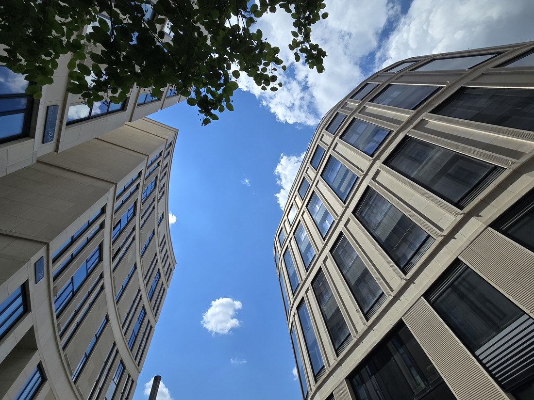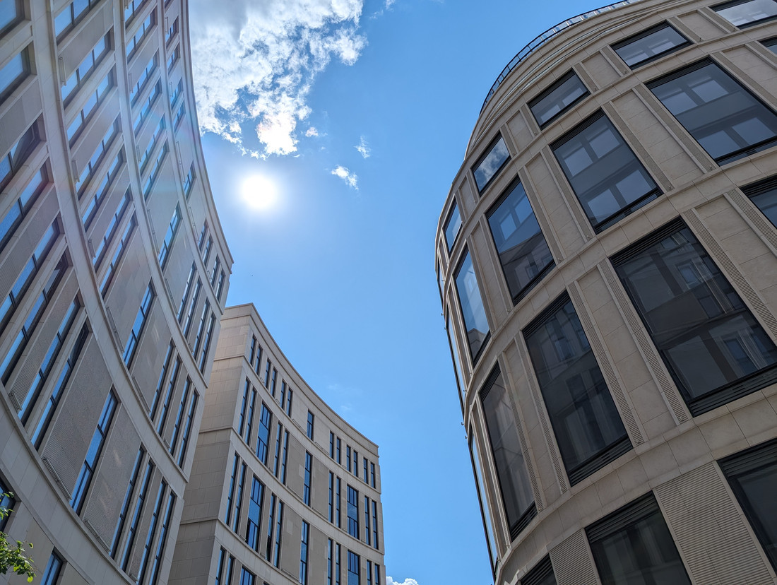 А вот солнце в кадре лучше всех выдерживает Google Pixel 8 Pro. Пятно светила равномерное, тут почти нет «зайца», а здание не потеряло детализацию.