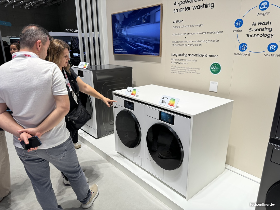 Например, одна из стирально-сушильных машин компании получила систему под названием AI Wash & Dry, которая (со слов производителя) автоматически корректирует стирку в зависимости от типа и объема белья, степени его загрязнения и качества ткани — самому выбирать режимы теперь, видимо, не обязательно.