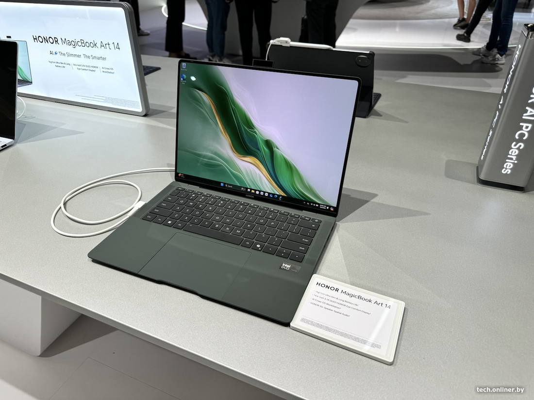 Общий павильон со смартфонами и планшетами по размерам относительно скромный. Однако несколько интересных гаджетов найти получилось. Например, Honor Magic V3, который компания называет «самым тонким в мире сгибающимся смартфоном».